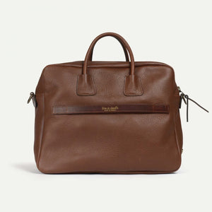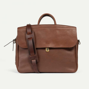 The Zeppo Solo is Bleu de Chauffe's little brother to the Zeppo. Its a lightweight format that keeps the elegance and signature details of the iconic business bag, with a single zipped compartment built for everyday professional use. It’s comfortable to carry thanks to handles reinforced with braided cotton cord, and inside you’ll find a spacious main compartment with a felt sleeve for laptops up to 16", plus a zipped cotton pocket hand-signed by the artisan who made the bag. Outside, an iconic pocket under the flap fits a magazine or notebook and closes with a vintage engraved Bleu de Chauffe closure, while a rear leather strip slips over a suitcase handle for easy travel; a small magnetic front pocket keeps essentials like keys, wallet, and phone close at hand.