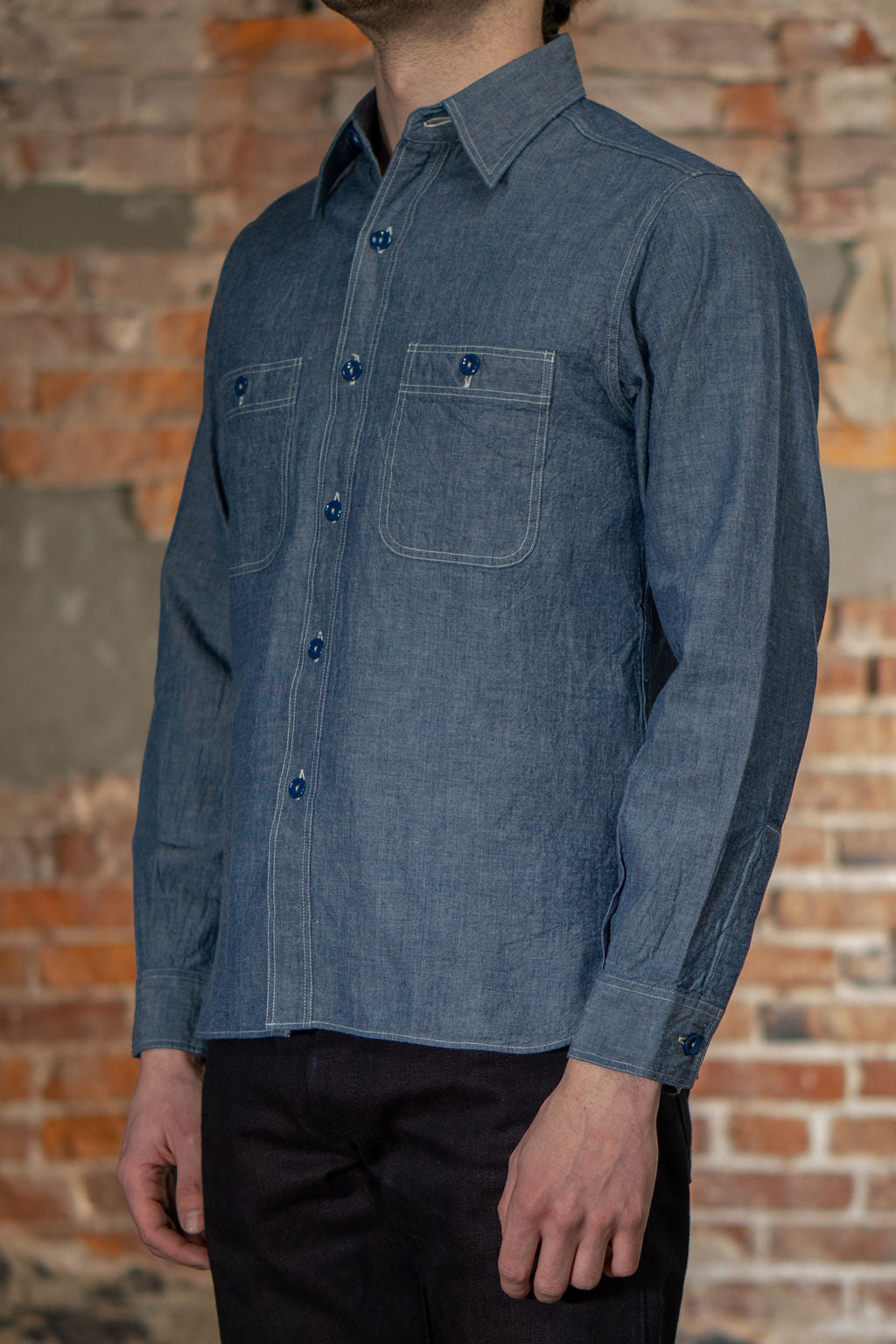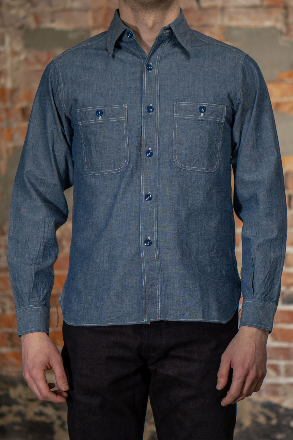 Adopted by the U.S. Navy into their standard uniform during WWII, the chambray shirt is a workwear staple. Known for being lightweight and utilitarian, chambray shirts are woven with a plain weave often with indigo dyed yarns. Buzz Rickson’s version is a reproduction of a 1950s era chambray, with gussets on both sides of the hem, a collar stand, and a separated front placket. This fabric is woven with loose tension giving it a textured look that will age beautifully with wear and wash.