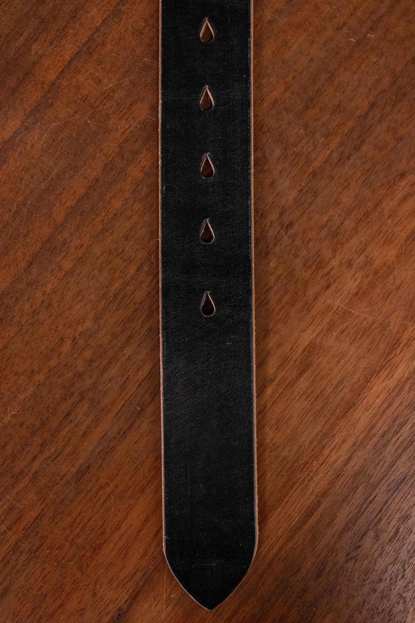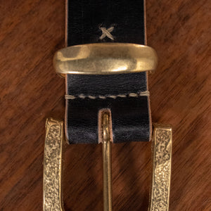 The Trail Belt is perfect for any occasion, not too thin and not too wide, coming in at 35mm, or 1.38". Each belt is made of 10oz thick leather, with a textured solid brass buckle, keeper loop, hand stitched buckle attachment, and teardrop holes. Each belt is handmade by Nicholas Hollows himself in his Oregon workshop.