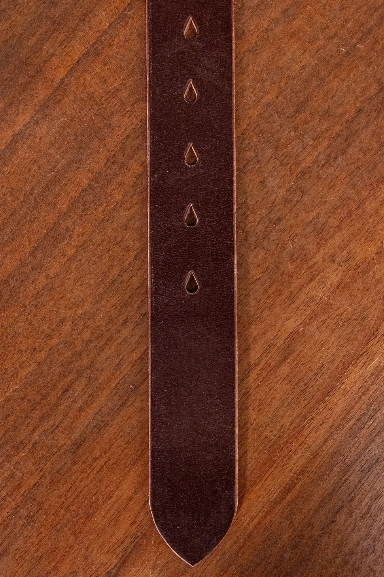 The Trail Belt is perfect for any occasion, not too thin and not too wide, coming in at 35mm, or 1.38". Each belt is made of 10oz thick leather, with a textured solid brass buckle, keeper loop, hand stitched buckle attachment, and teardrop holes. Each belt is handmade by Nicholas Hollows himself in his New York workshop.