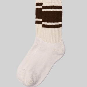 Retro Mono Stripe Socks in natural unbleached American-grown cotton add a welcome pop of color to your fit. These have a super comfy cushioned foot bed without being too thick and look great in both sneakers and boots. Crew height and universal fit.
