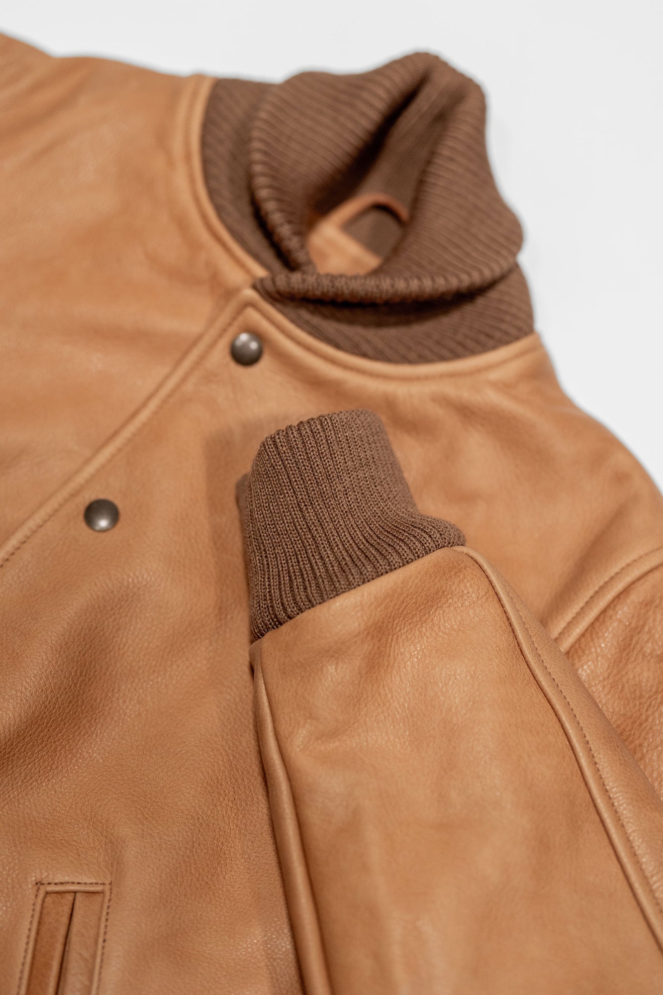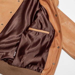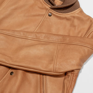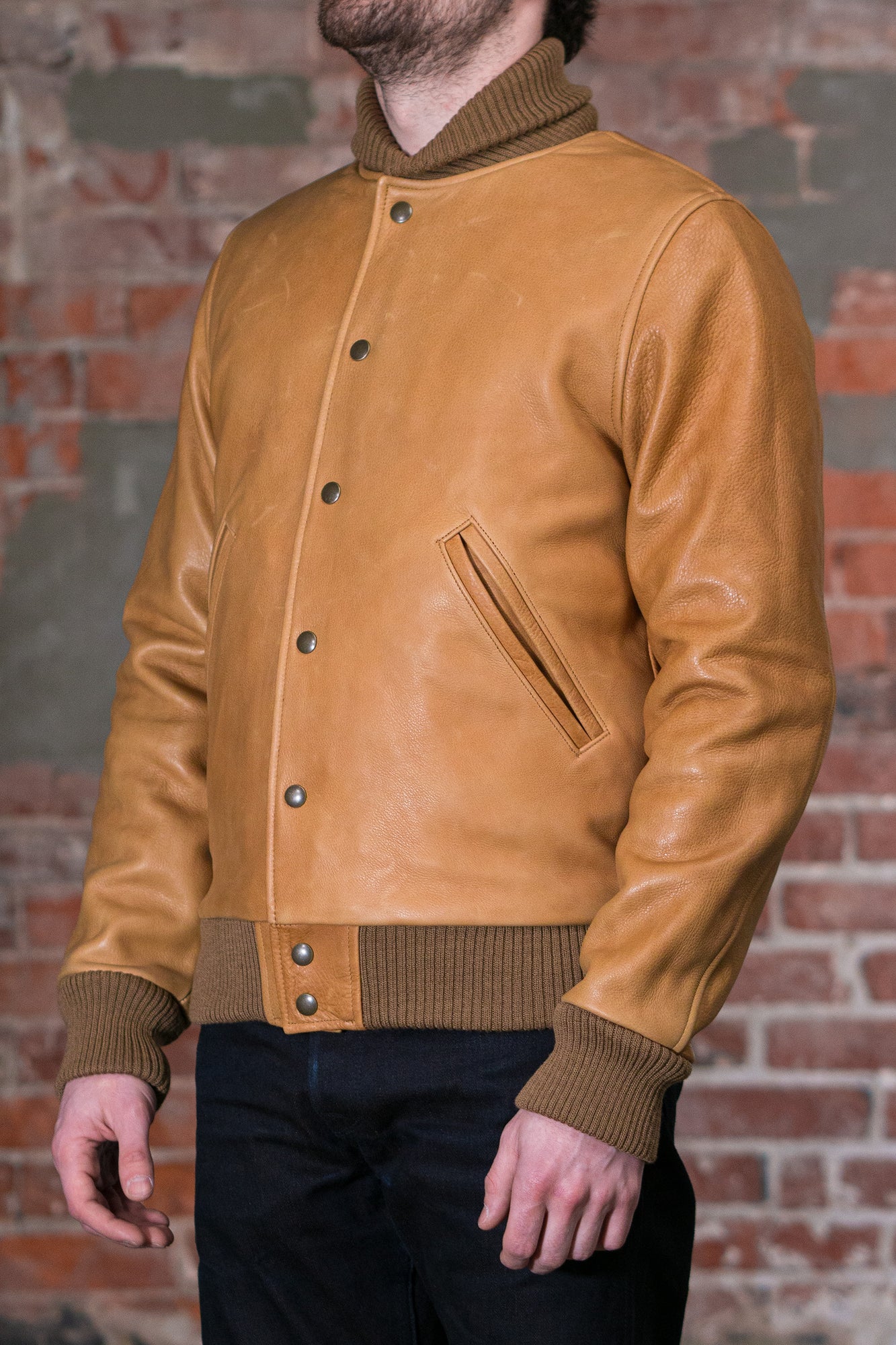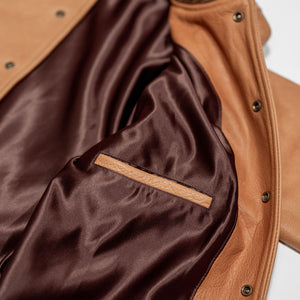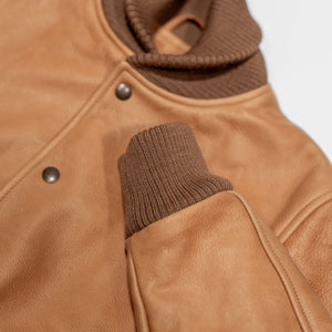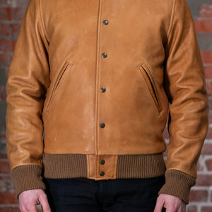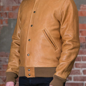 Though they've been making varsity jackets for seven decades, the All-City is Dehen's very first entirely leather varsity. Built from a buttery soft, 3oz cowhide leather, the All-City is extremely comfortable from the start and drapes beautifully. The Rust colored leather will continue to dark with good wear, and is a perfect canvas for the leather's grain. The All-City is finished with all the furnishings you'd expect from Dehen including wool trims knit in-house by the brand.