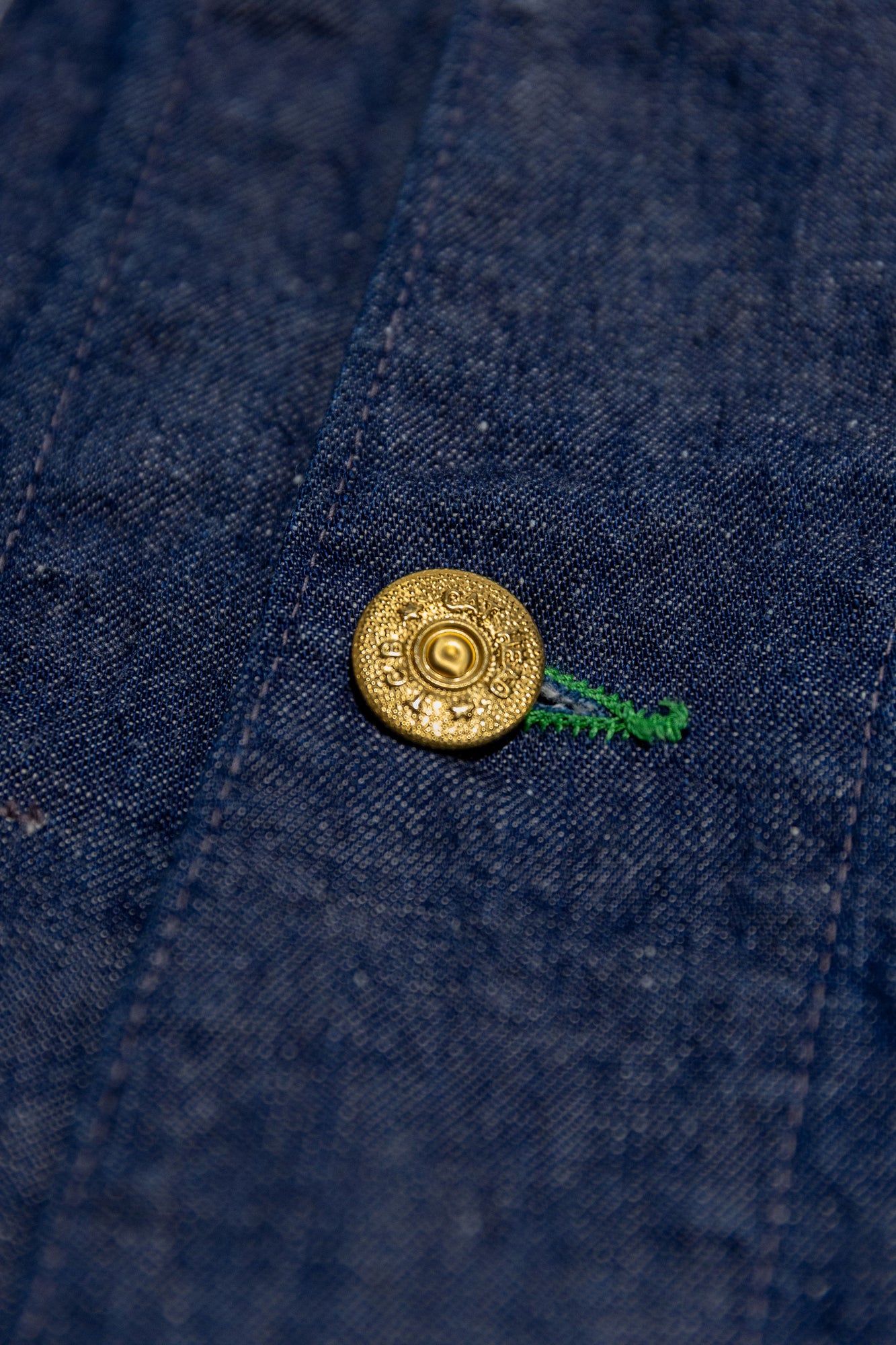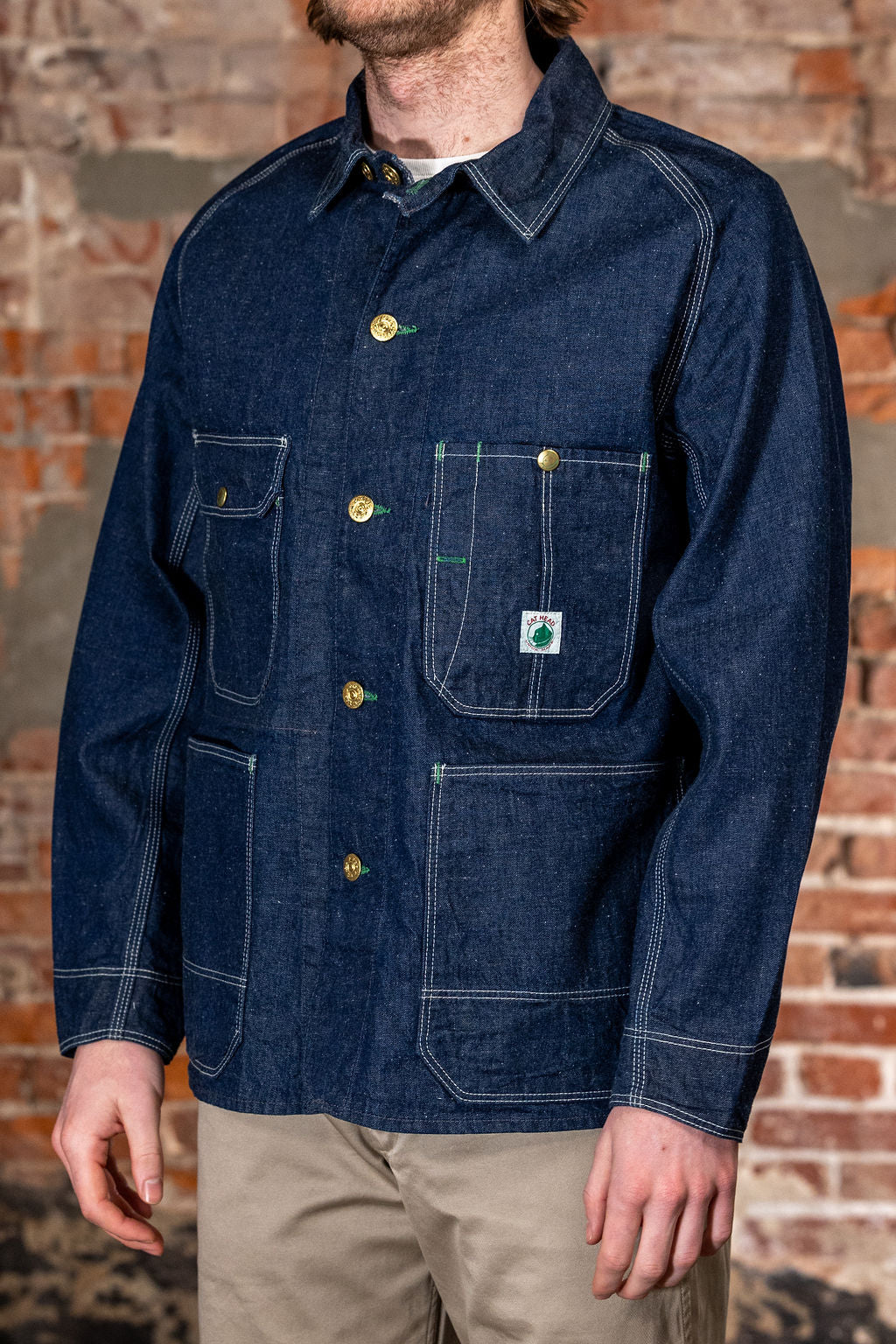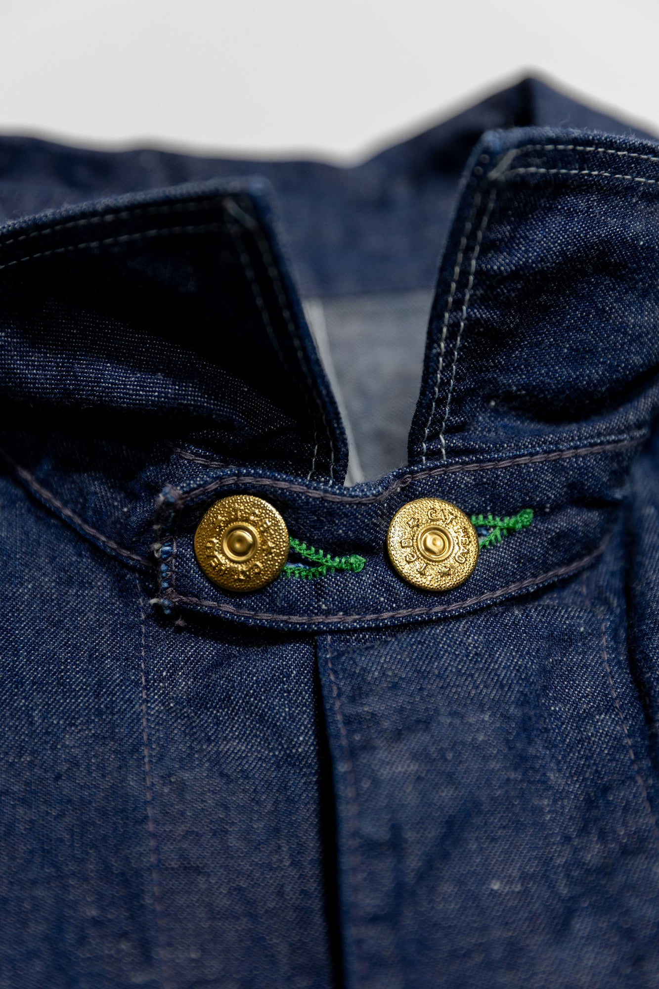 This chore coat pulls from a 1930s Duck Head original, brought to life through a mix of close study and a bit of luck finding the right reference piece. From the custom animal-inspired branding and varied button hardware to the green bar tacks that fade with wear, the details stay rooted in vintage workwear but feel considered, not overdone. Construction follows suit, with a rare chain-stitched neckband recreated using specialized machinery to match the original build. The fabric is just as dialed, made from a mix of yarns and rope-dyed for depth. Unsanforized and one-washed, this unprocessed denim is full of character and wears in naturally over time, picking up character the more it’s used.