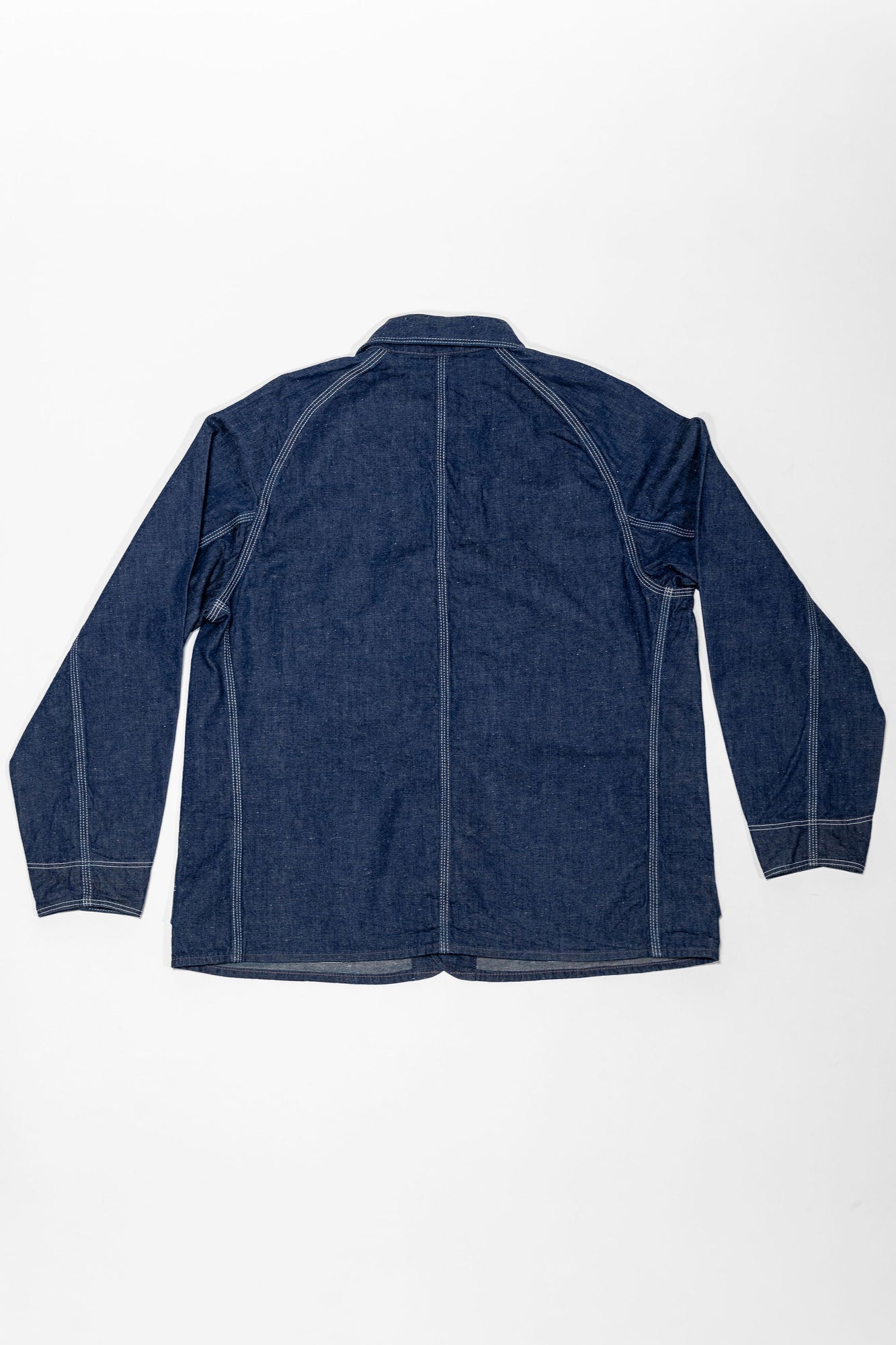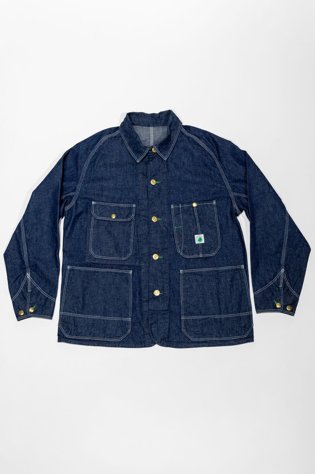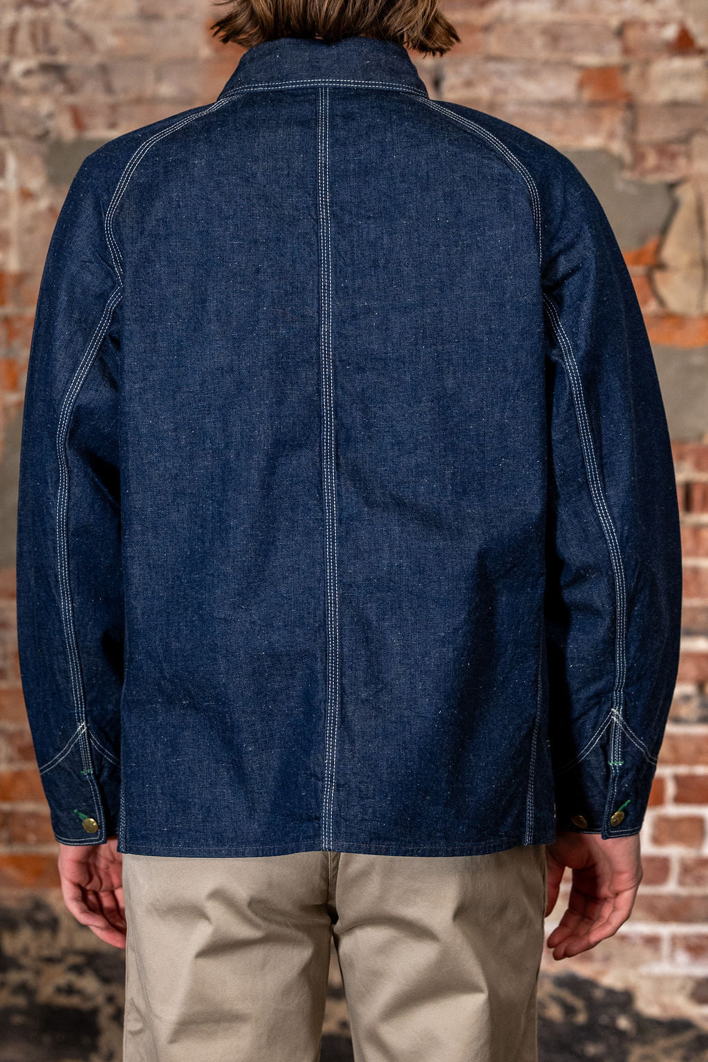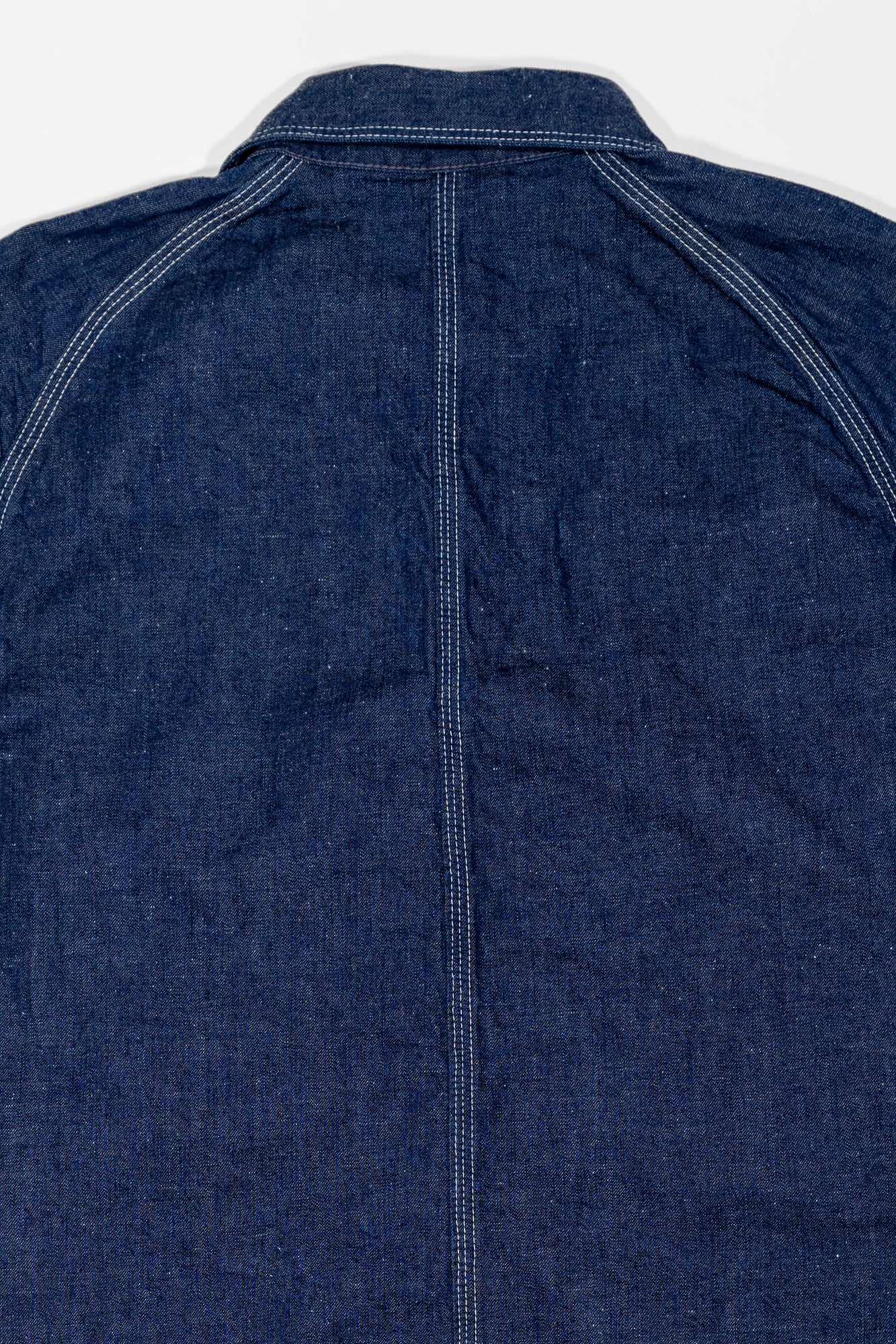 This chore coat pulls from a 1930s Duck Head original, brought to life through a mix of close study and a bit of luck finding the right reference piece. From the custom animal-inspired branding and varied button hardware to the green bar tacks that fade with wear, the details stay rooted in vintage workwear but feel considered, not overdone. Construction follows suit, with a rare chain-stitched neckband recreated using specialized machinery to match the original build. The fabric is just as dialed, made from a mix of yarns and rope-dyed for depth. Unsanforized and one-washed, this unprocessed denim is full of character and wears in naturally over time, picking up character the more it’s used.