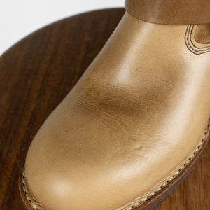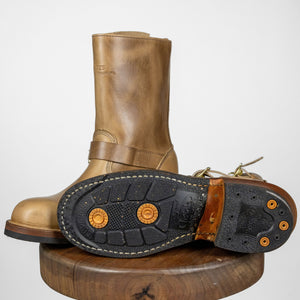 White's Boots' engineer boot is a nod to the classic old school motorcycle boot, featuring a 10" shaft and a full structured toe box. We asked, and they delivered: for the first time ever we have a Dr. Sole Supergrip Sole on the bottom of a pair of White's Boots, capping off the old-school look and feel. Built on White's 1970s Arch-Ease last, the gently curving lines from the toe to the stacked heel give these a highly distinct silhouette, instantly recognizable as White's. This version of our Engineer collaboration is built with Horween's Natural Chromexcel, a leather that patinas beautifully with age, and finished with brass hardware for an extra classic look.