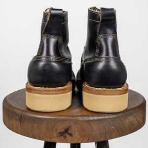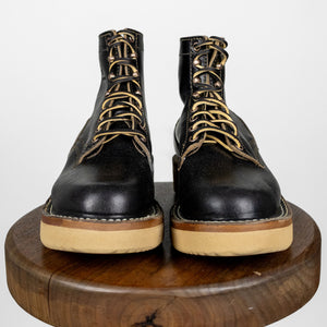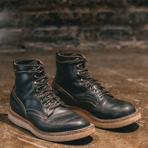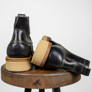 The White's Boots x Franklin & Poe Trolley Hopper was given its name by Luke, our head repairman, who hops the Route 15 trolley every morning to the shop. Needing a boot that's comfortable for being on the move all day long, Luke opted for the Trolley Hopper, our modified Rambler Boot. Built on a 55 Arch-Ease last, this boot is made of a sturdy but supple Black Chromexcel leather and a slightly cushioned Vibram 2021 wedge sole for extra comfort for extended periods of standing and walking.