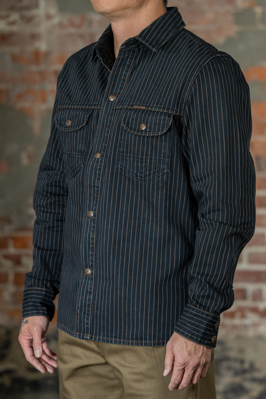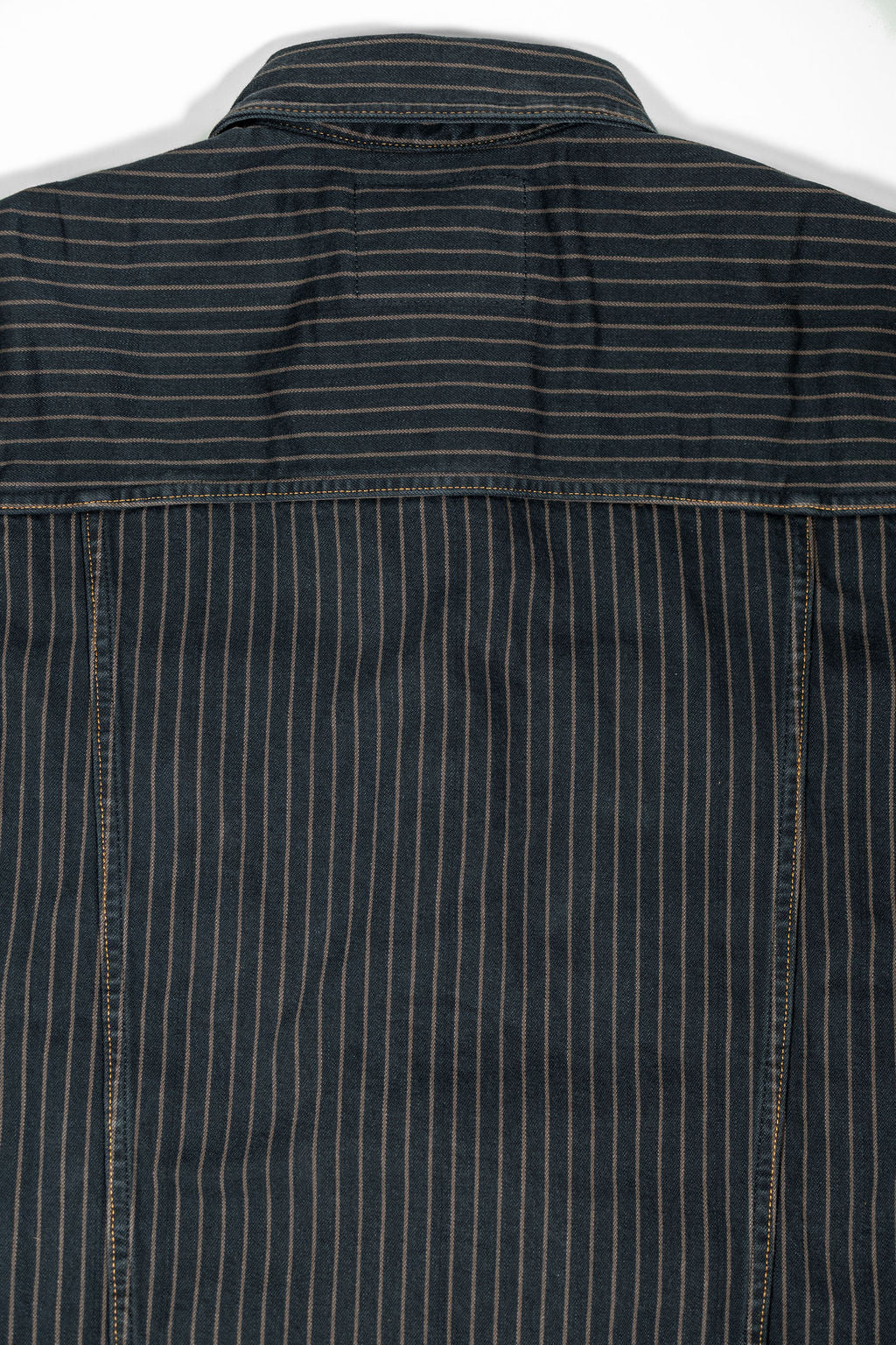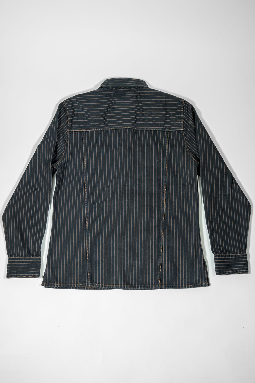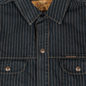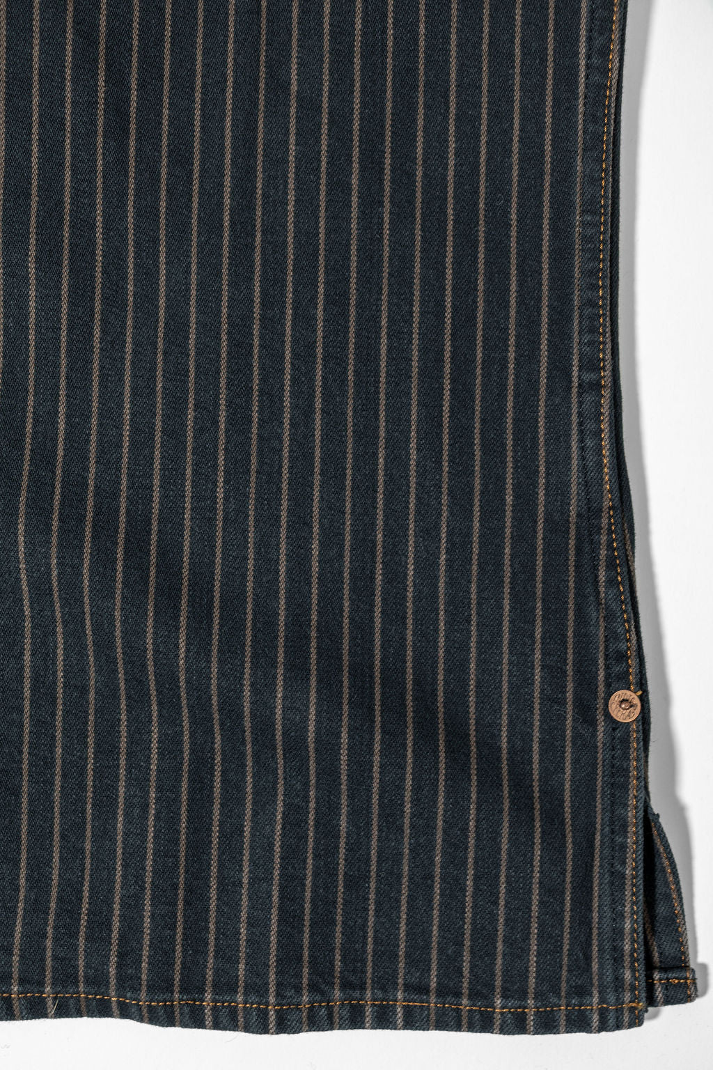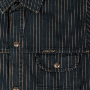 The Indigofera Copeland is one of our favorite layering pieces. Affectionately known as the little sibling to the Fargo, the Copeland is sturdy-as-hell and features two front pockets and side slits. This version is made of a durable denim fabric with a subtle brown stripe. The exterior is accented with brass snap buttons, and the interior collar and cuffs are lined.