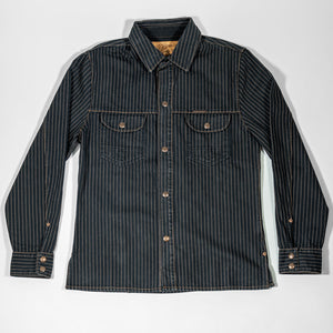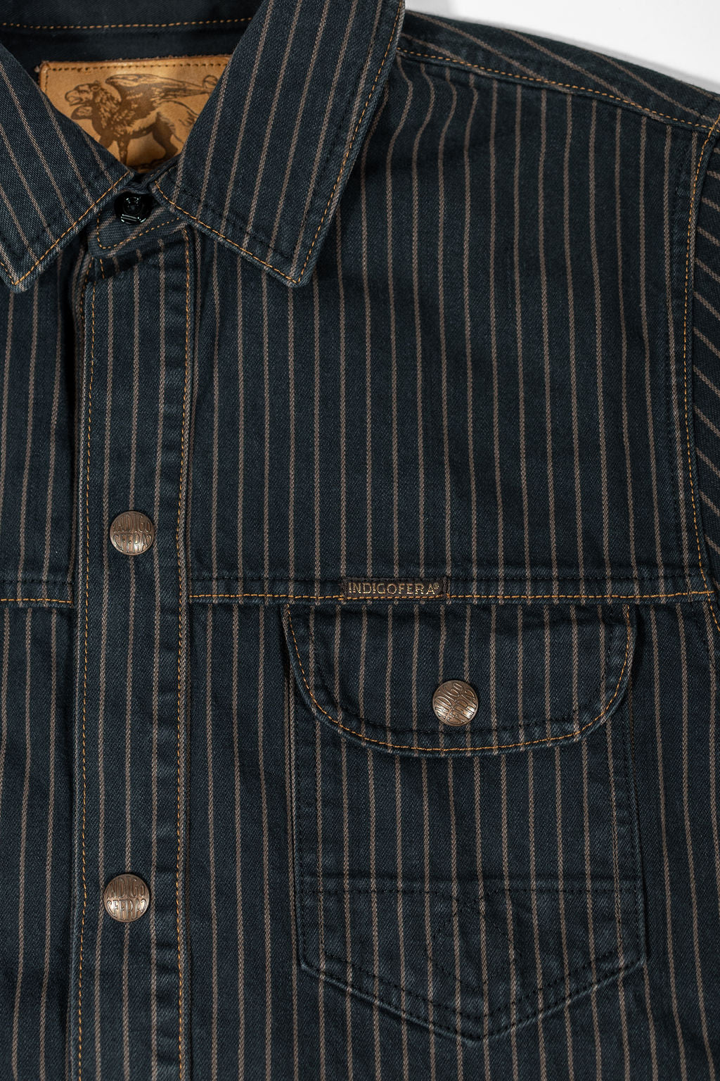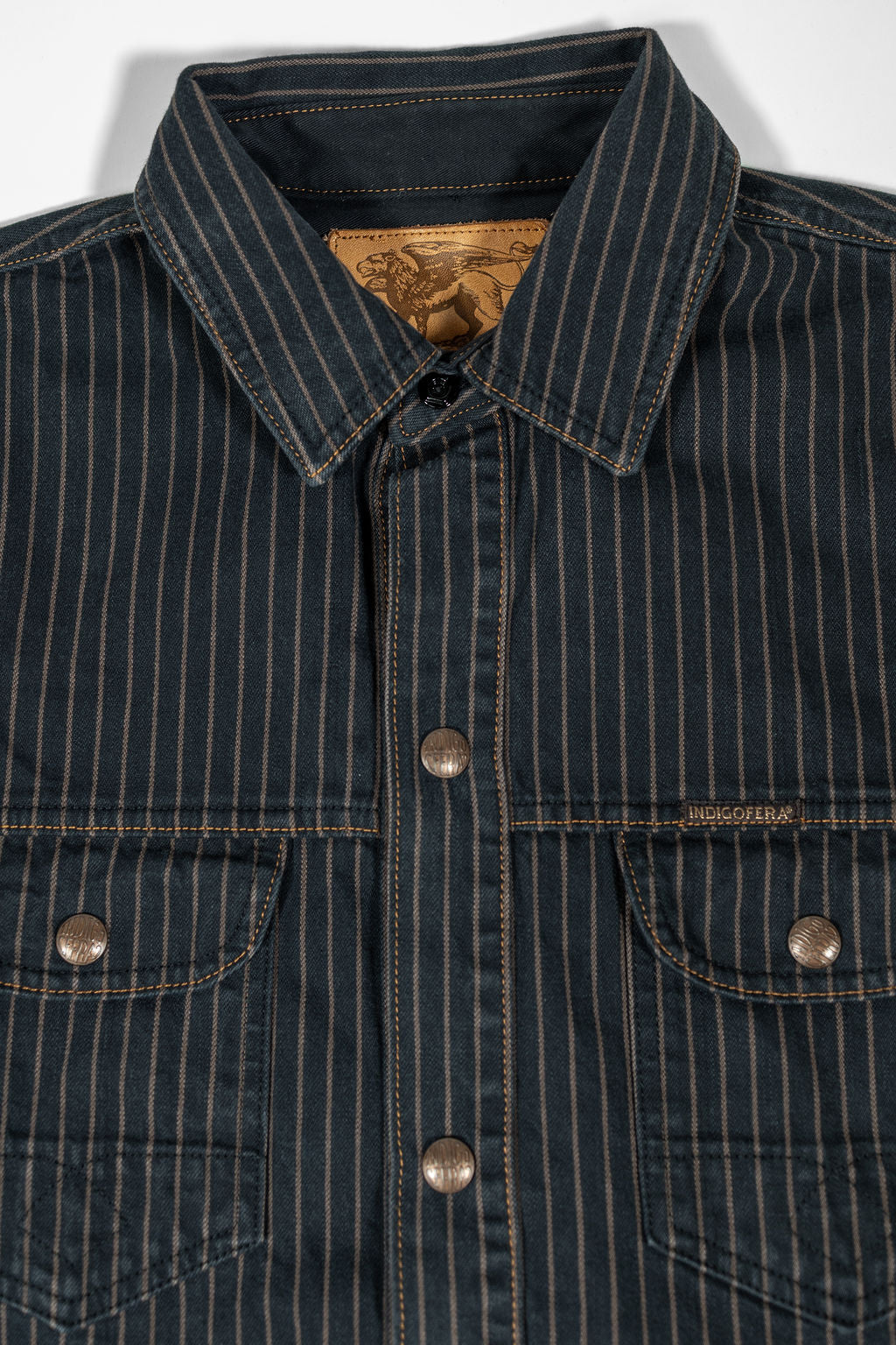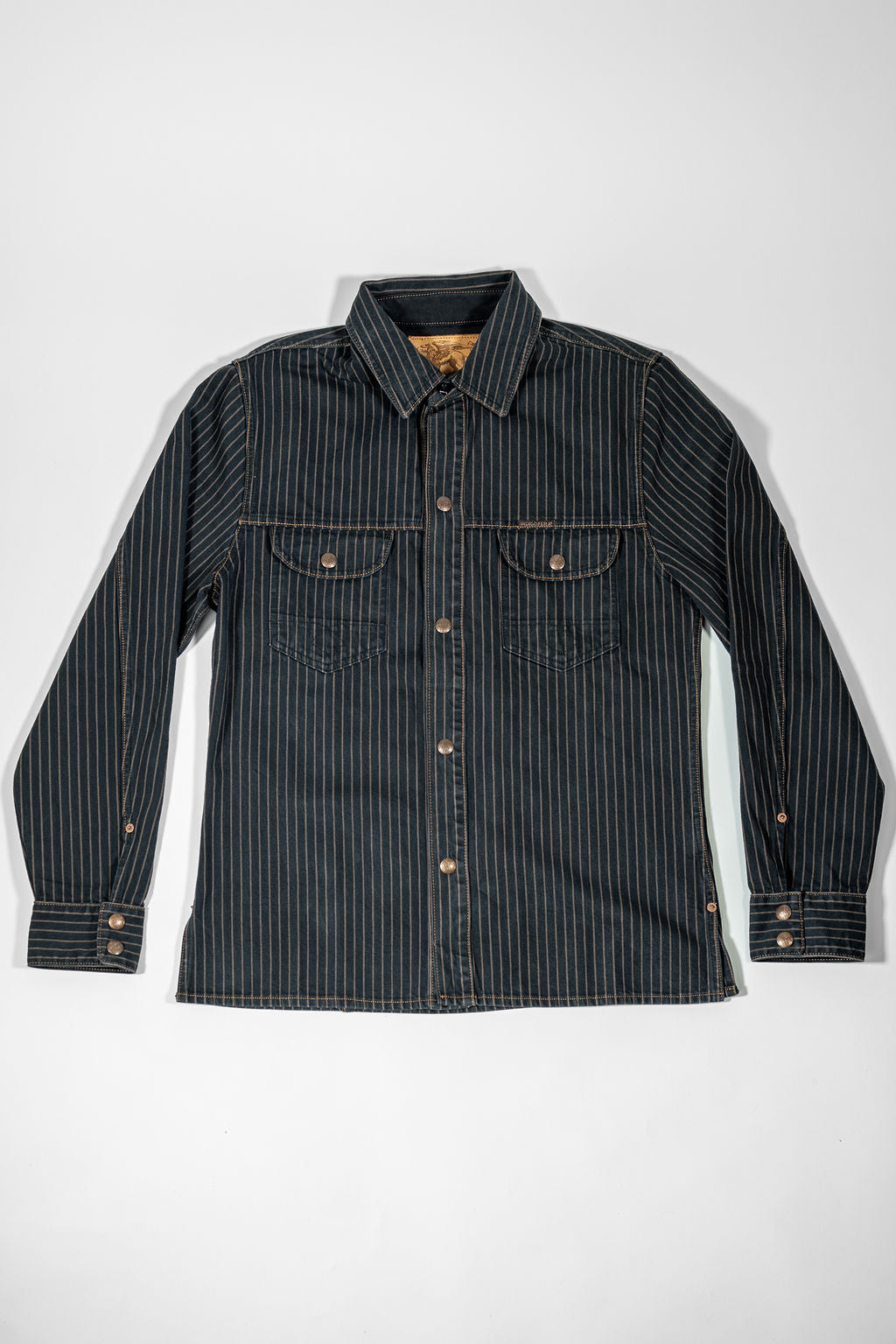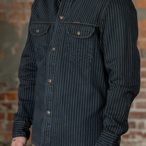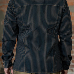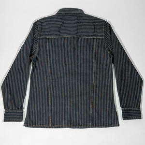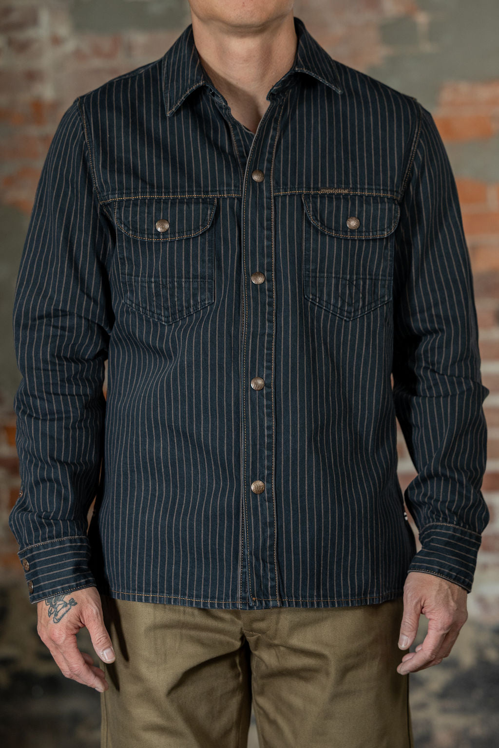The Indigofera Copeland is one of our favorite layering pieces. Affectionately known as the little sibling to the Fargo, the Copeland is sturdy-as-hell and features two front pockets and side slits. This version is made of a durable denim fabric with a subtle brown stripe. The exterior is accented with brass snap buttons, and the interior collar and cuffs are lined.