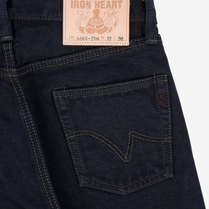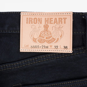 The Iron Heart IH-888S-21 jean is Iron Heart's version of the ever popular relaxed taper cut. Cut from the brand's famed 21 oz. denim, surprisingly soft to anyone who hasn't felt it before, the 888 has a medium-high rise with a relaxed thigh and top block. The 888 tapers tastefully from the top block down to the hem, giving the leg just the right amount of shape. The indigo fabric has received an overdye in black sulfur dye; over time the black will fade to indigo before ultimately fading to white.