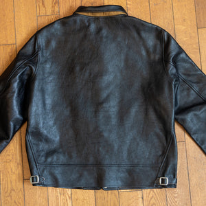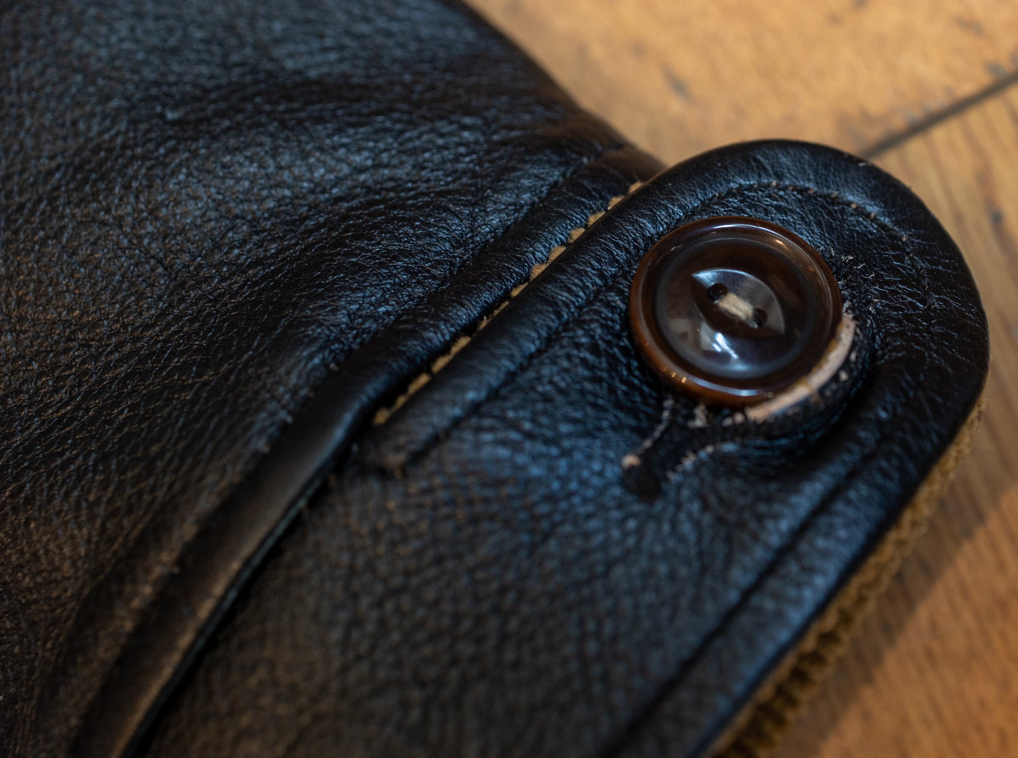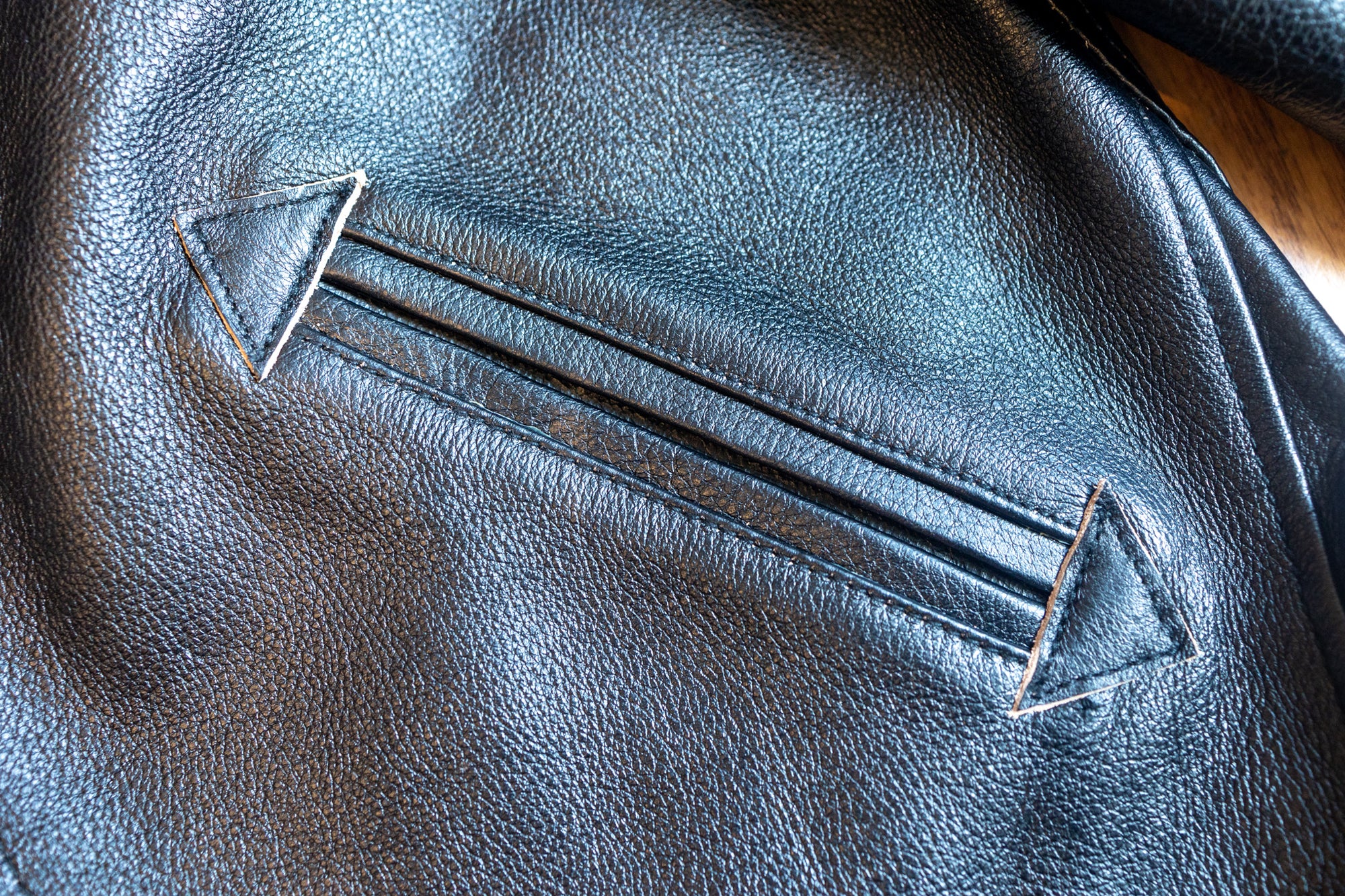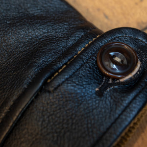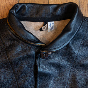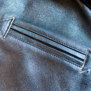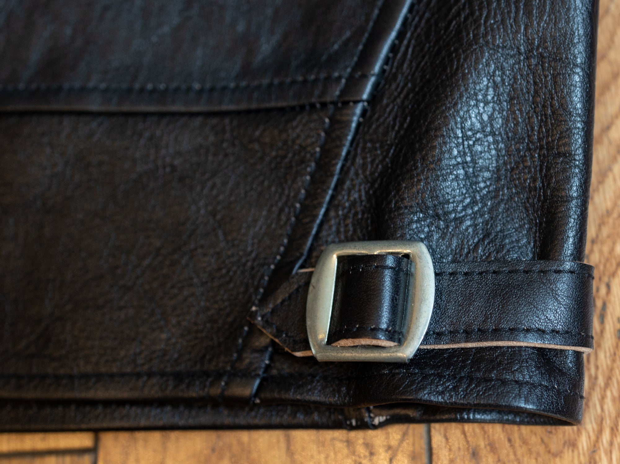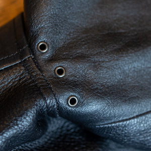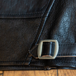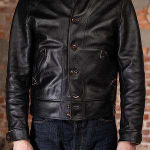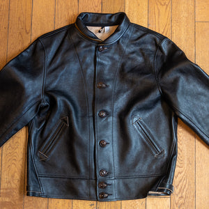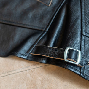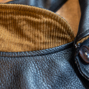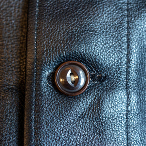 The Campus Jacket is one of the most iconic pieces in the Mister Freedom collection. Christophe Loiron's take on the 1930s Cossack style jacket, fitted and waist length, is a blank canvas waiting for you to wear, tan, and mold to exactly how you like it. The jacket is made from a 2-3oz black veg tan tea-core American leather. With good wear, the leather will patina and reveal the undyed, natural color of the flesh beneath the overcoat of black.