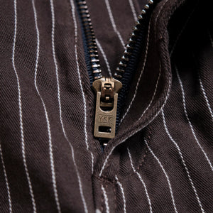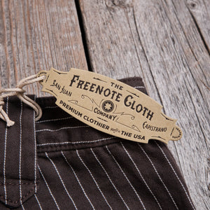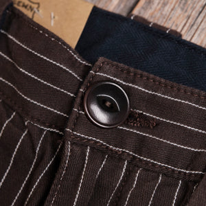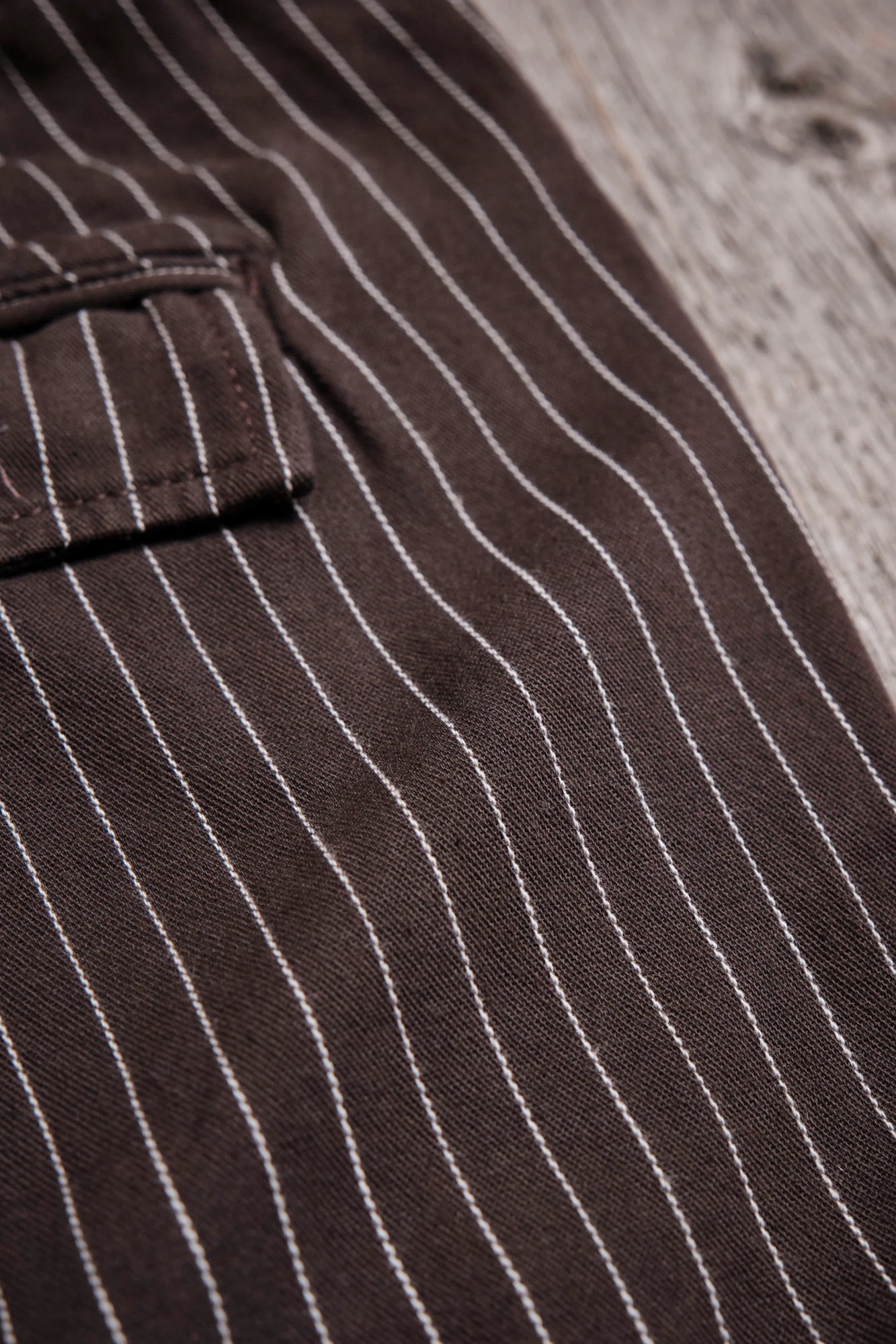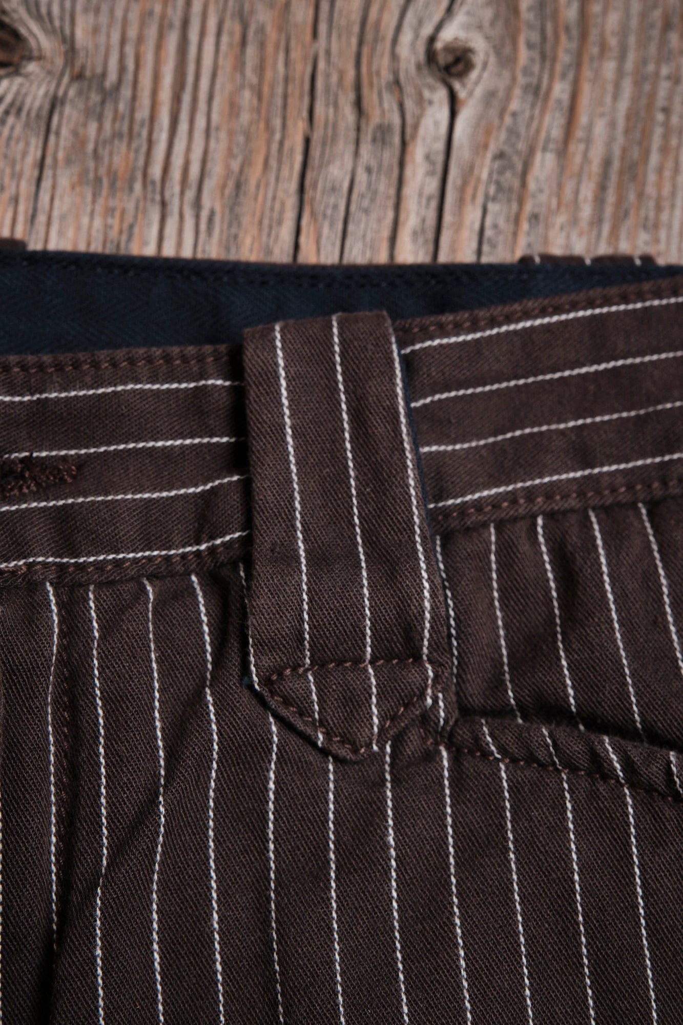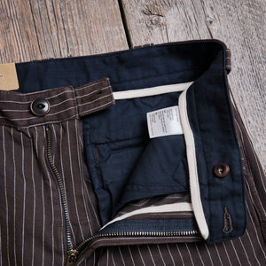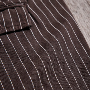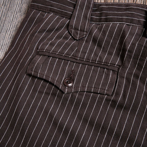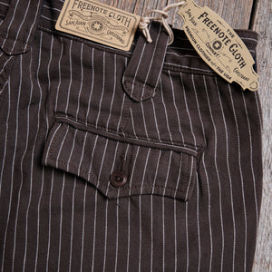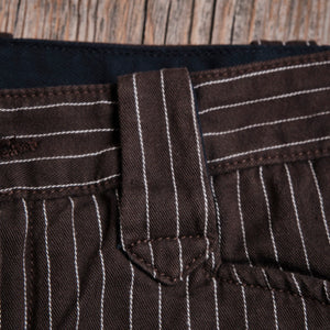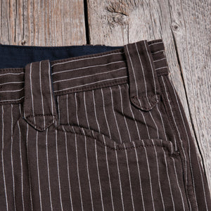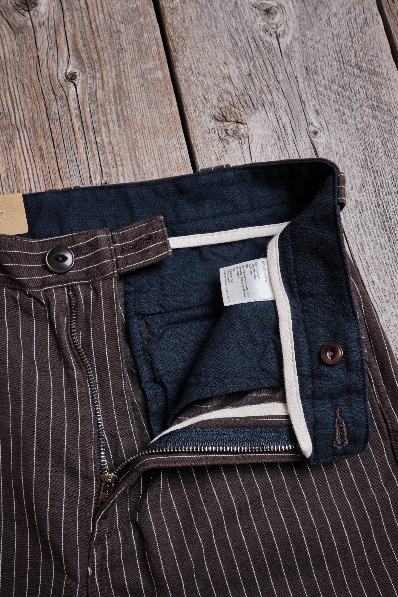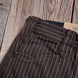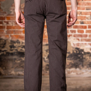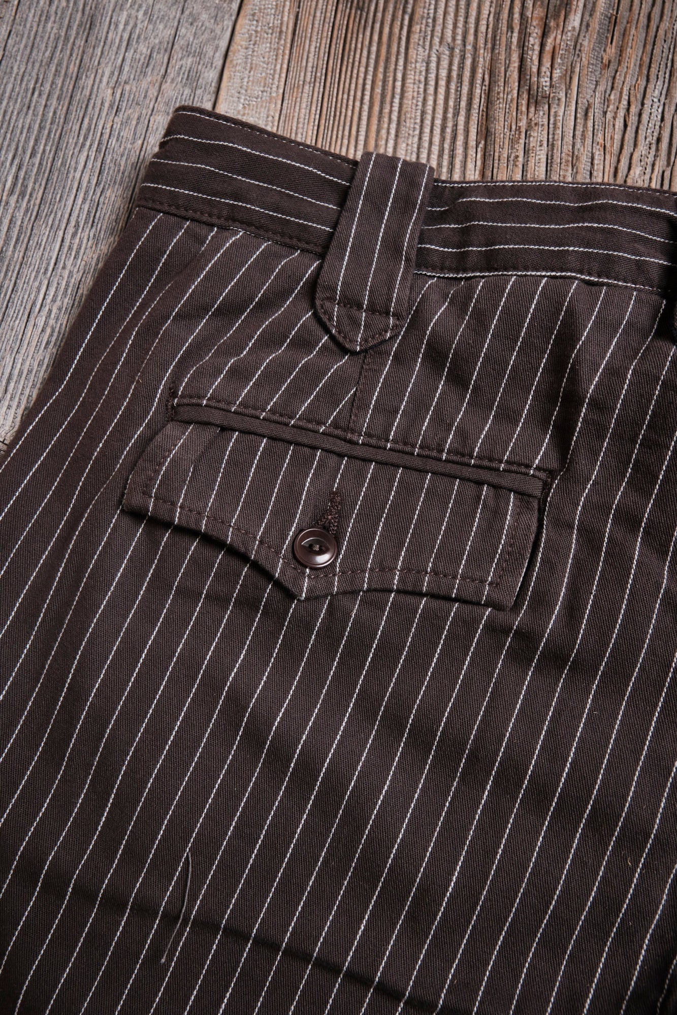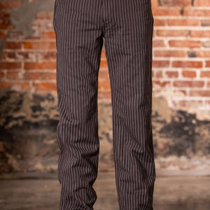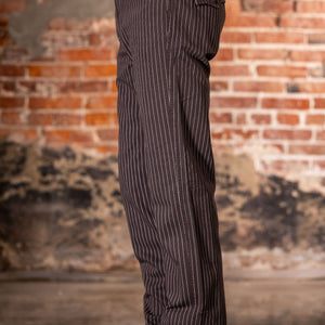 The Duster Pant is based off vintage western-style dress pants with its frog-mouth font pocket details and back pocket flaps. This fit sits higher on the waist, provides ample room in the top block, and is a straight leg to go over those western or engineer boots. This version of the Duster is cut from a pinstripe Japanese twill that can be dressed up or dressed down.