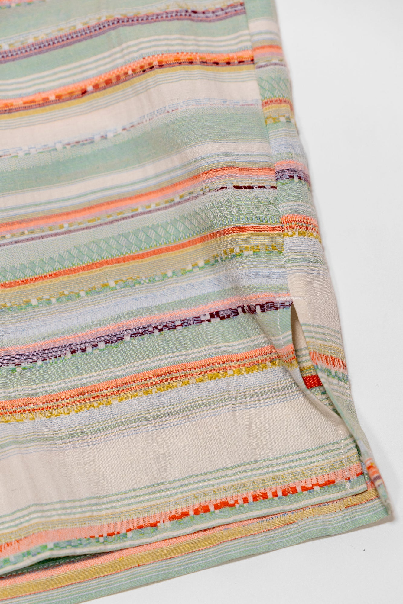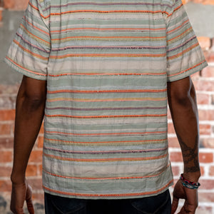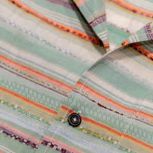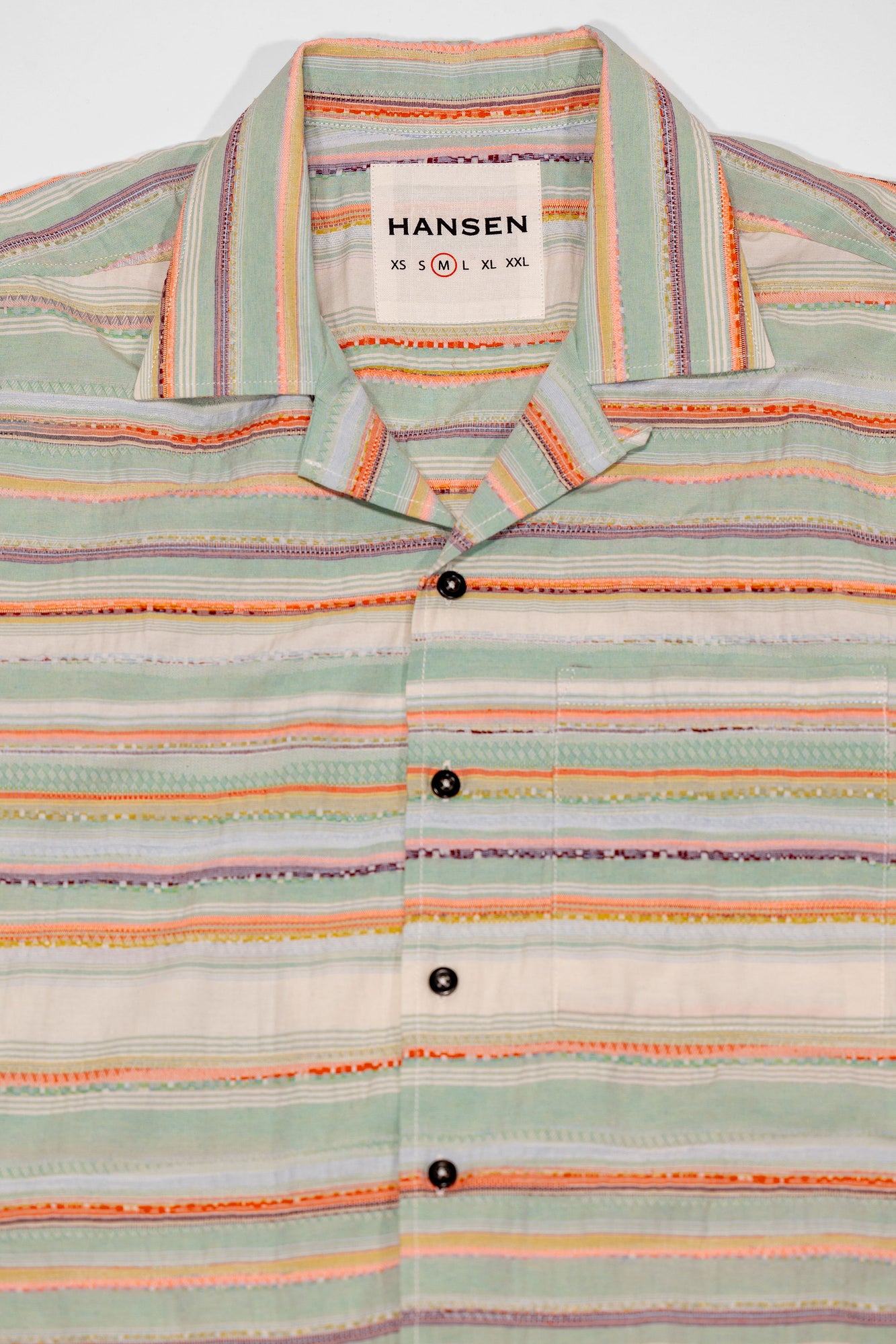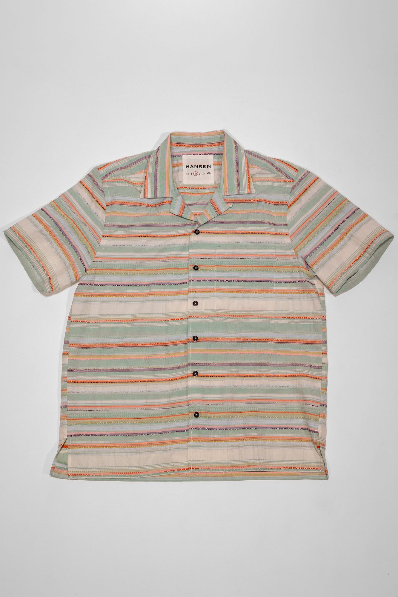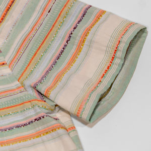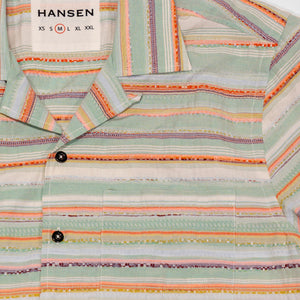 Perfect for warmer weather, the Caleb shirt from Hansen Garments is a camp collar shirt made from a zany, multi-colored multi-textured fabric. Using different yarns in various colors and textures to create a vibrant pattern, the resultant fabric is reminiscent of traditional weaving techniques. A boxy, cropped fit pairs perfectly with camp collar and care-free fabric, creating a retro, fun vibe. Elegant, french seam construction shows the elevated attention to detail that Hansen gives to all of their pieces.