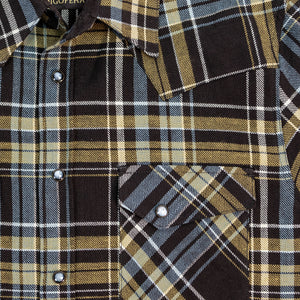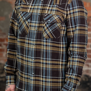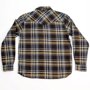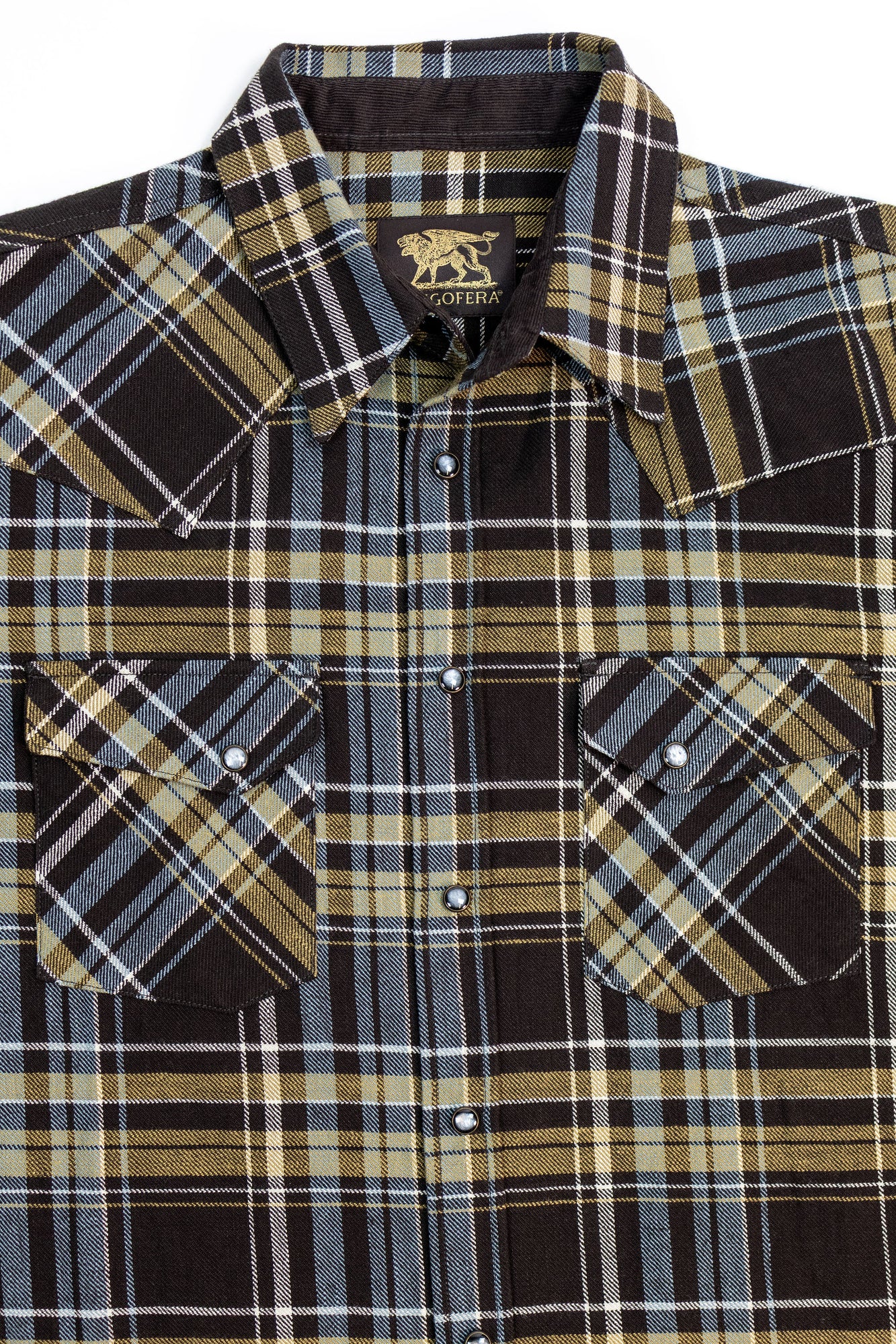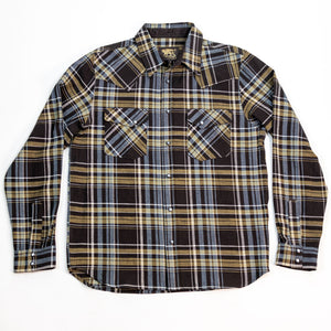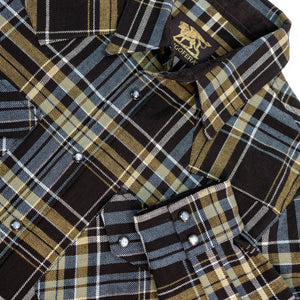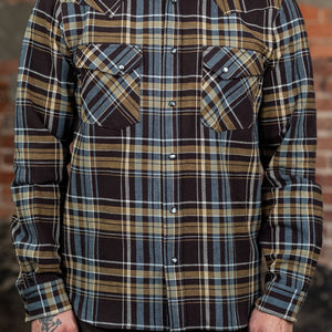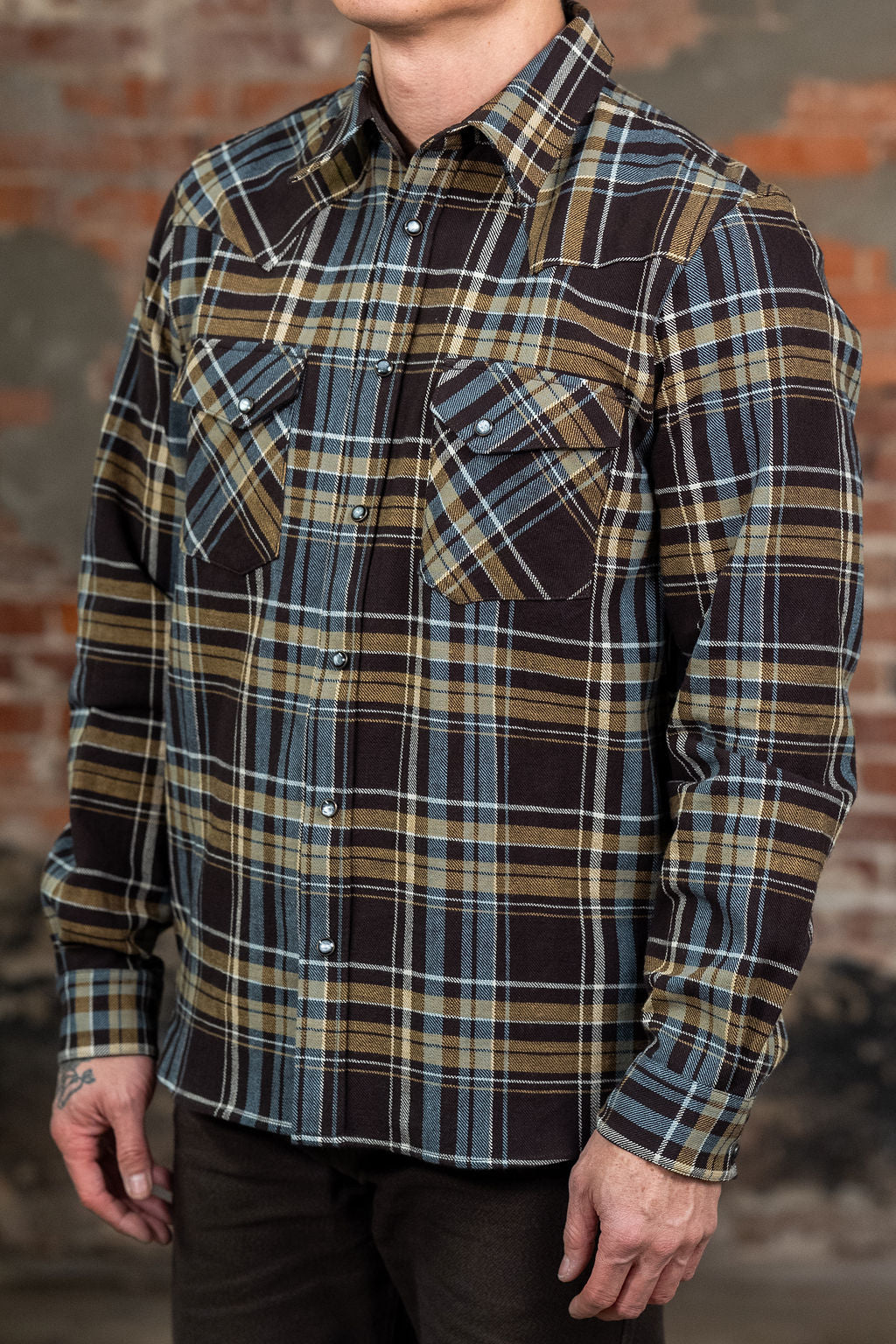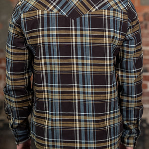 Every year, Indigofera presents a stunning fabric choice on their Dawson flannel, and this year's version is no exception. A western styled flannel, the Dawson is cut from a sturdy cotton flannel fabric, with a retro, four color check pattern. Furnished with nebulous, black pearl snaps, and lined at collar and cuffs with brown corduroy, the Dawson is a great choice for anyone looking to make a statement this winter.