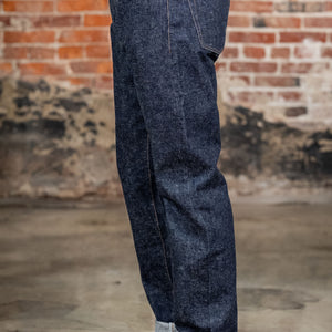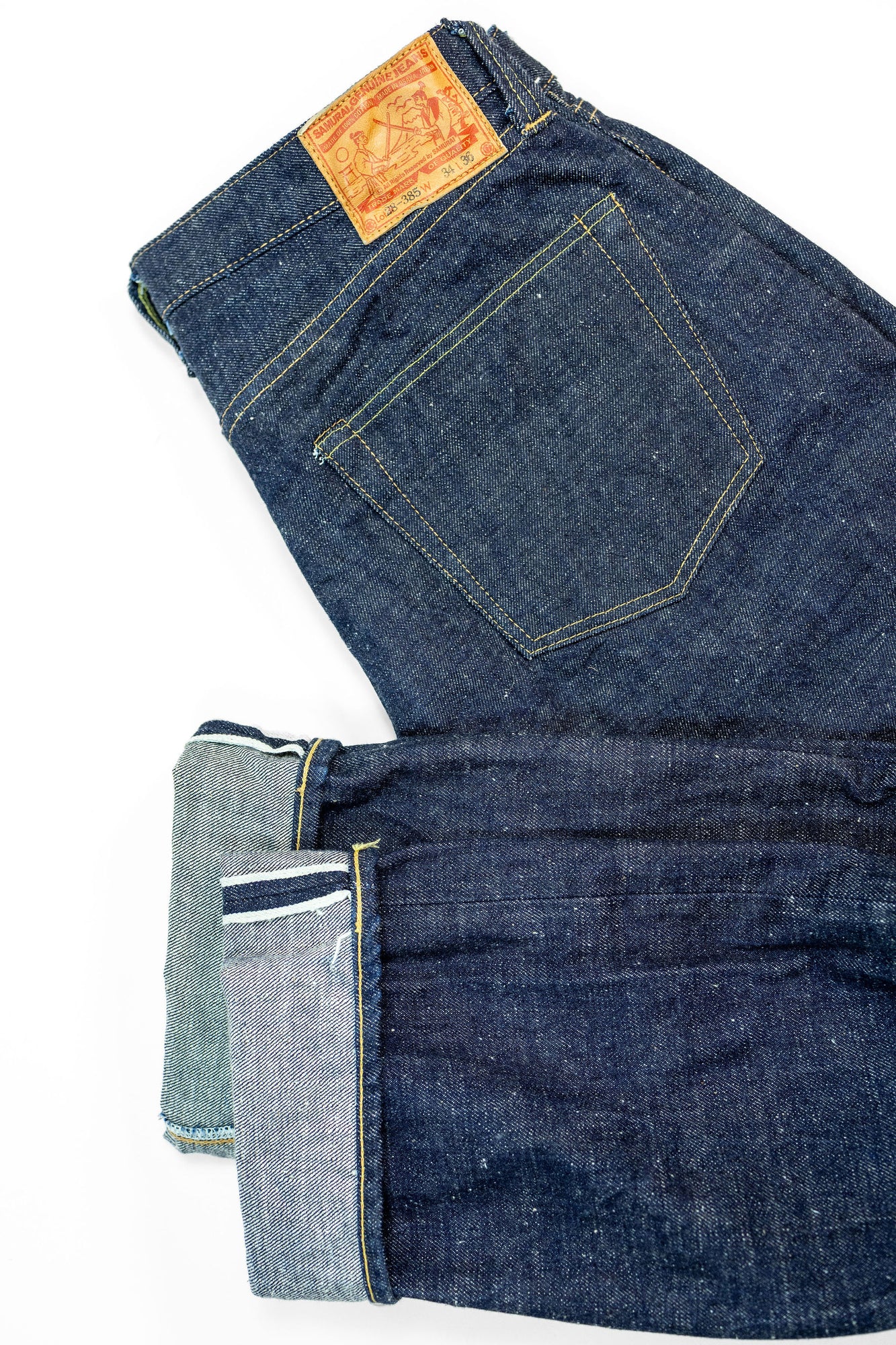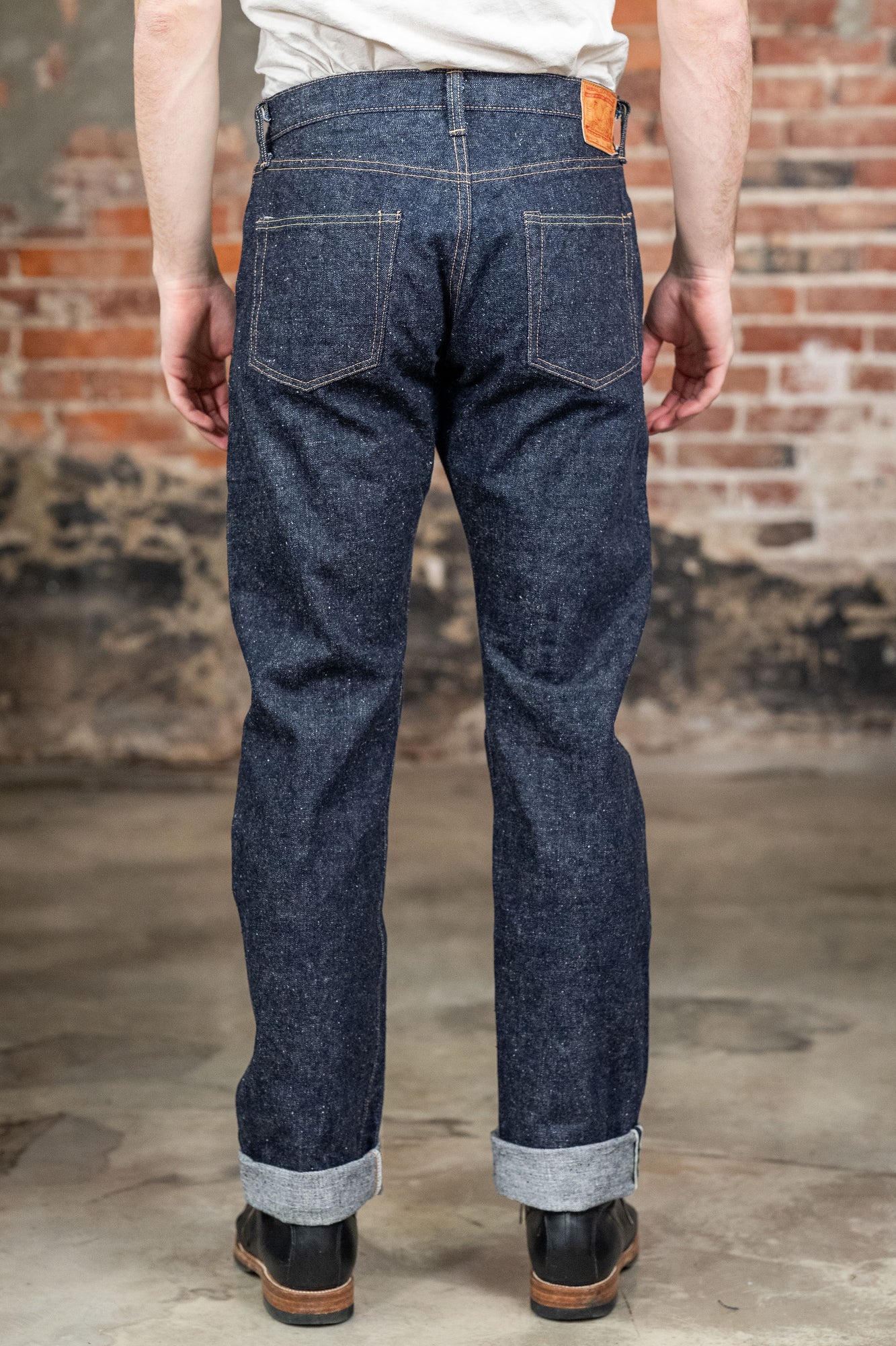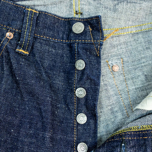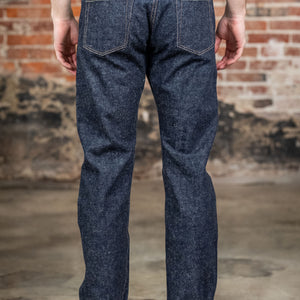 Samurai's S510 is a straight fit that's not too baggy, with a medium-high rise and room in the top block and throughout the leg. The fabric is woven on the famed Toyoda GL3 loom, the first power loom used to make denim in Japan over half a century ago. Only able to produce 5 meters of fabric an hour and kept running with parts from decommissioned machines, the GL3 offers us a glimpse of the characterful denim that was being produced in the mid 20th century. To make the fabric even more special, the weft threads are comprised of Samurai Cotton Project yarns, and the jeans are finished with custom branded iron buttons and thick, two-pronged hidden brass rivets.