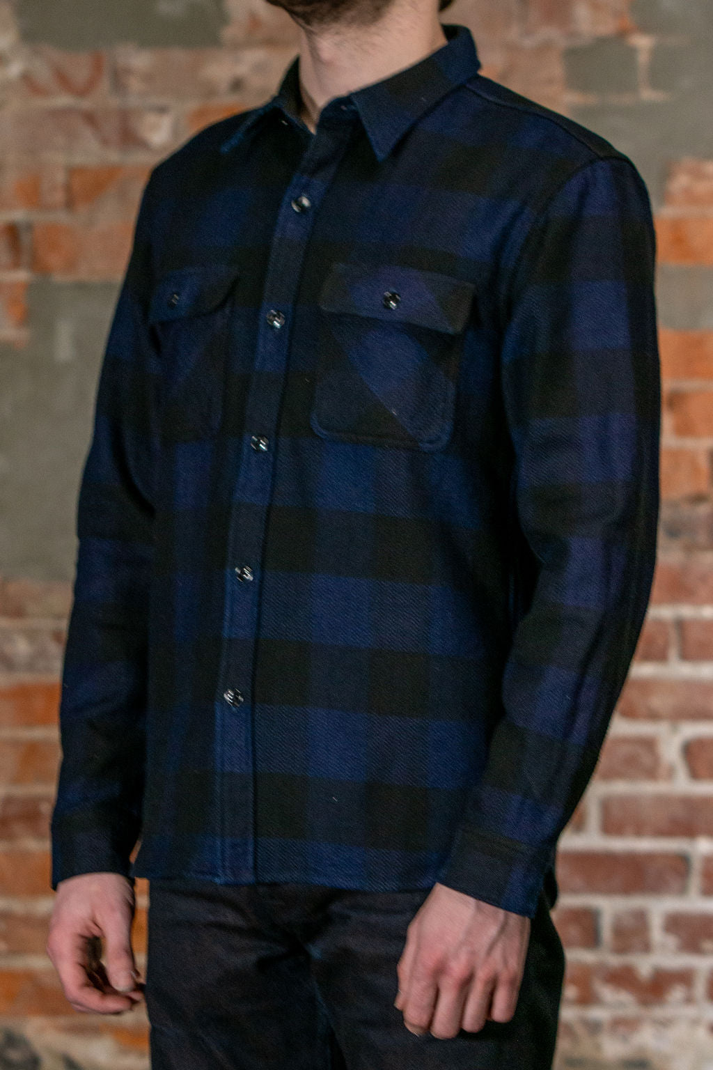For this season, The Flat Head has released a special Block Check Flannel that's been woven using yarn dyed with indigo rope dyeing. Over time, this flannel will fade developing characteristics unique to the wearer. These block check flannels are made from a herringbone weave in a buffalo check pattern. Woven on old shuttle looms, the flannels have uneven yarns providing both a textured hand and heat retention. The inside is brushed for comfort, and the flannel is finished with urea cats-eye buttons.