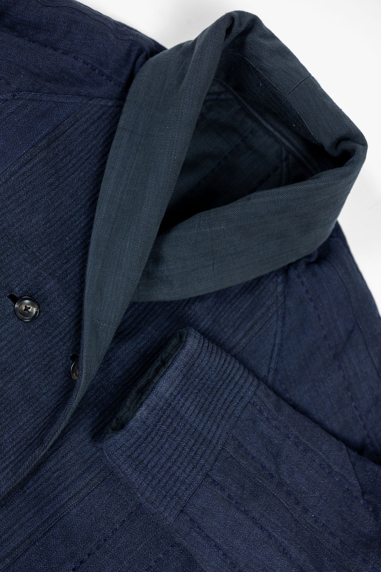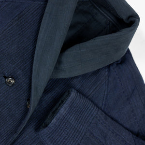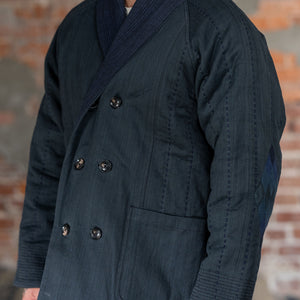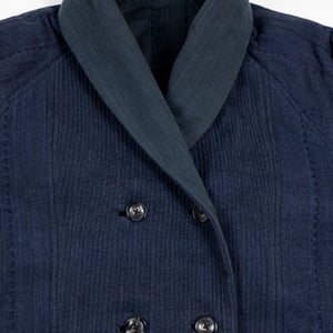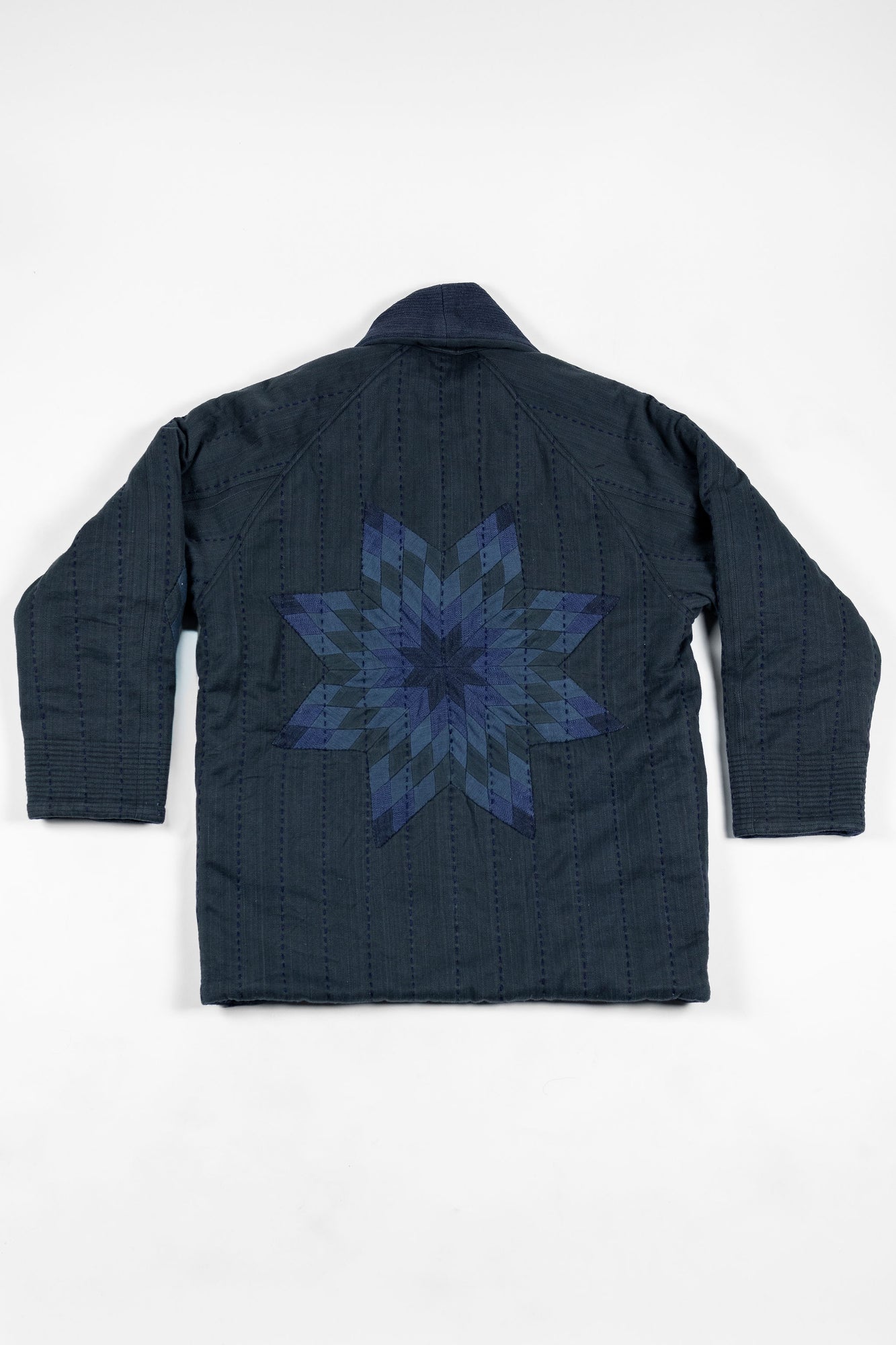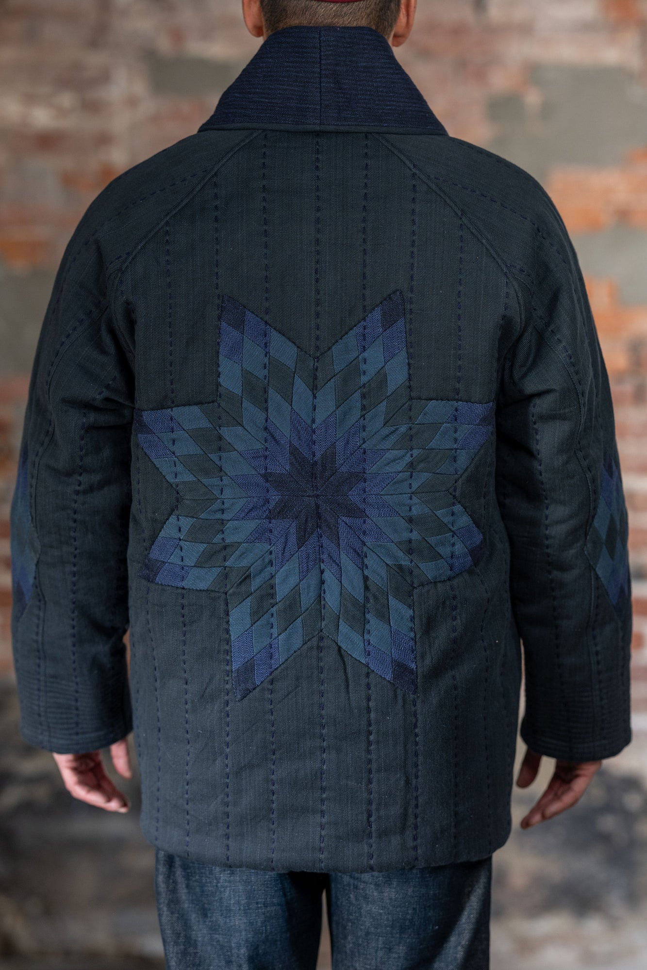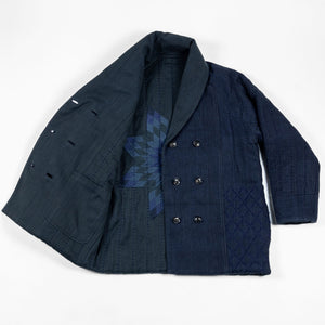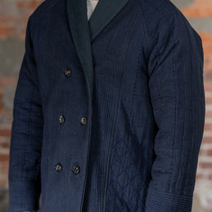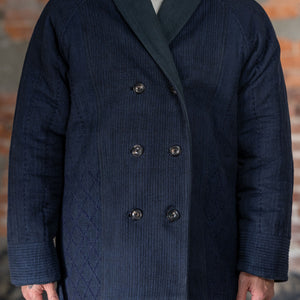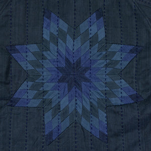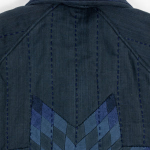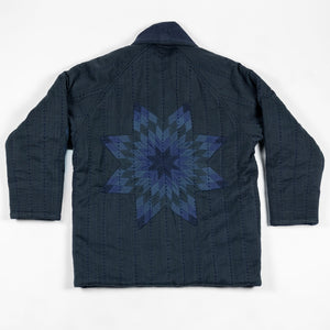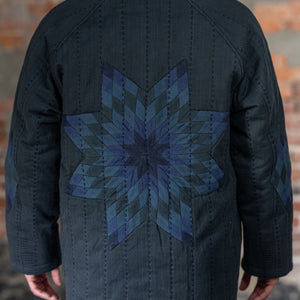 The Reversible Shawl Overcoat is based on Vintage military Mackinaw Coats from the 1940’s. As the name states, this overcoat is reversible, with one side showcasing Indi + Ash's iron/indigo military herringbone, and the reverse side showing the brand's iron/indigo denim fabric. One side features a stunning Morningstar quilt applique while the reverse has kendo jacket inspired diamond kantha stitching. The entire garment is has diamond quilting throughout, which was manually quilted on a sewing machine to control the amount of batting. The collar, placket, and cuffs feature trapunto stitching done on a single needle machine. Each side has a six button horn closure.