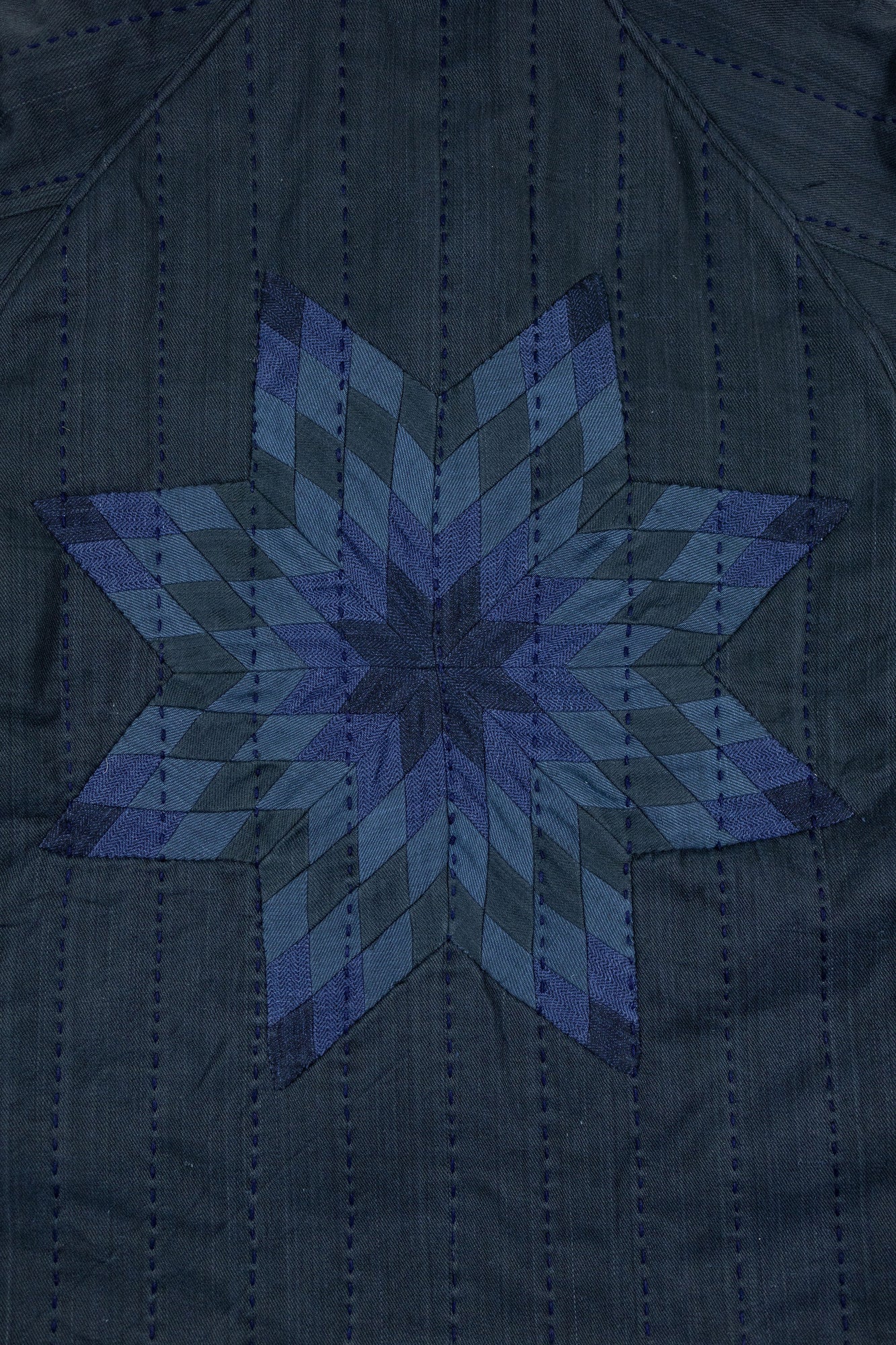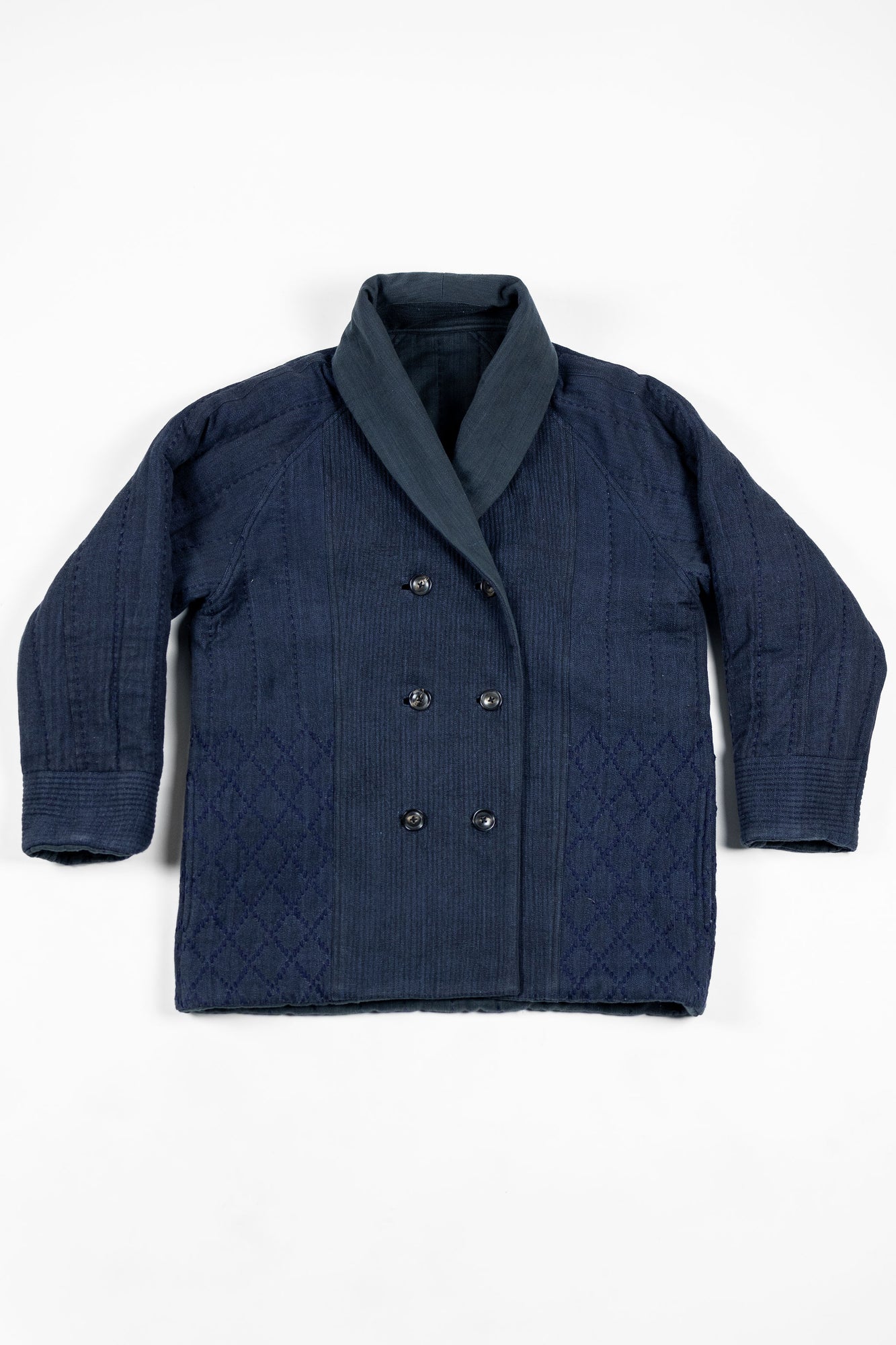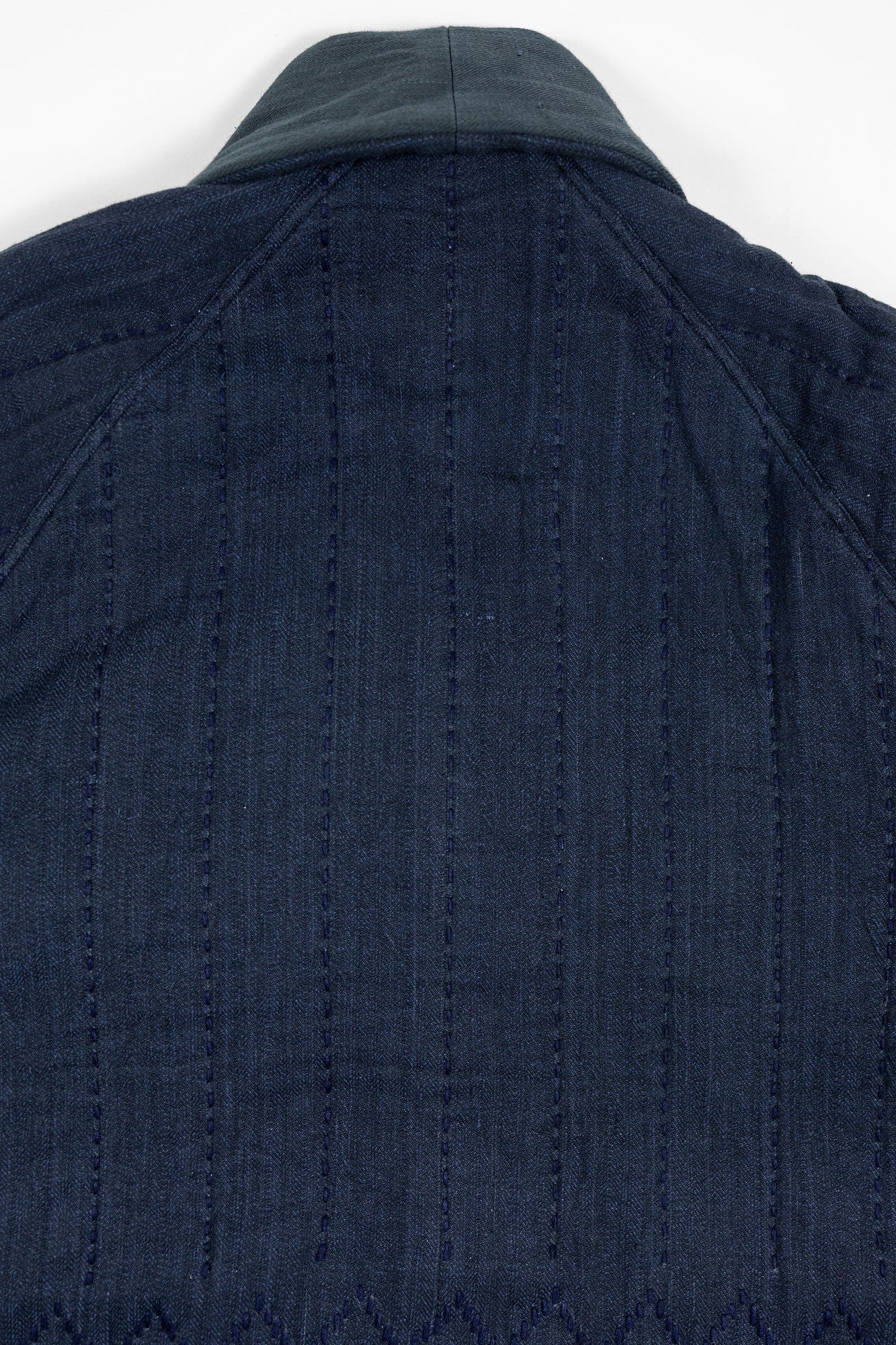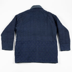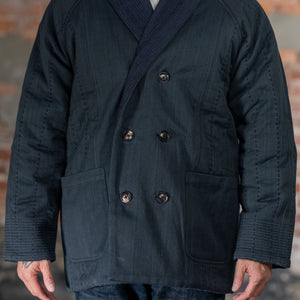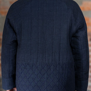 The Reversible Shawl Overcoat is based on Vintage military Mackinaw Coats from the 1940’s. As the name states, this overcoat is reversible, with one side showcasing Indi + Ash's iron/indigo military herringbone, and the reverse side showing the brand's iron/indigo denim fabric. One side features a stunning Morningstar quilt applique while the reverse has kendo jacket inspired diamond kantha stitching. The entire garment is has diamond quilting throughout, which was manually quilted on a sewing machine to control the amount of batting. The collar, placket, and cuffs feature trapunto stitching done on a single needle machine. Each side has a six button horn closure.