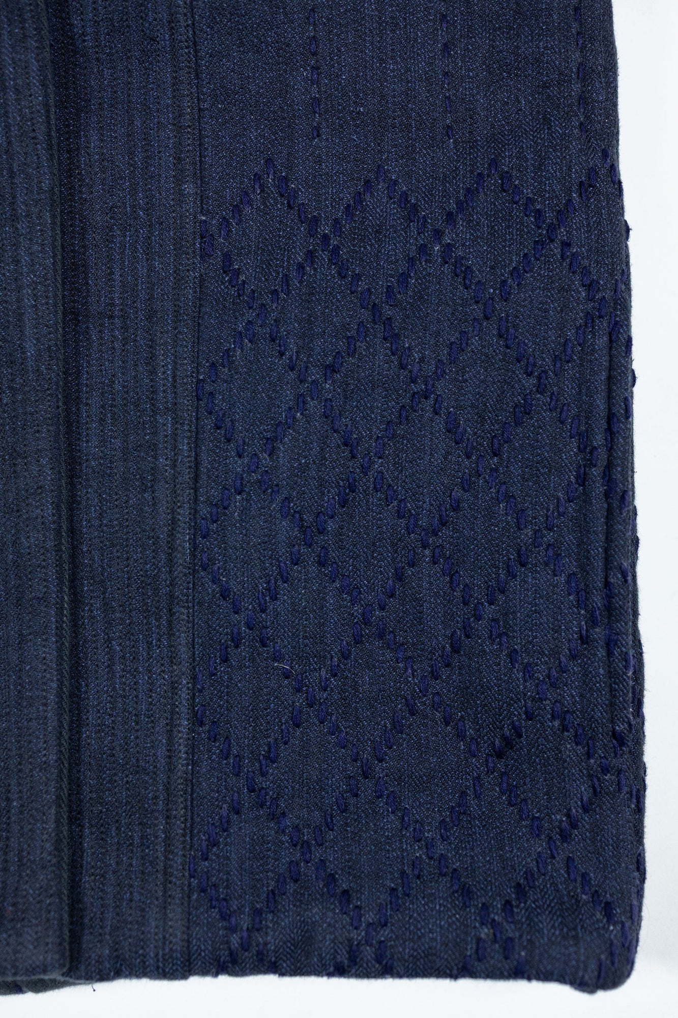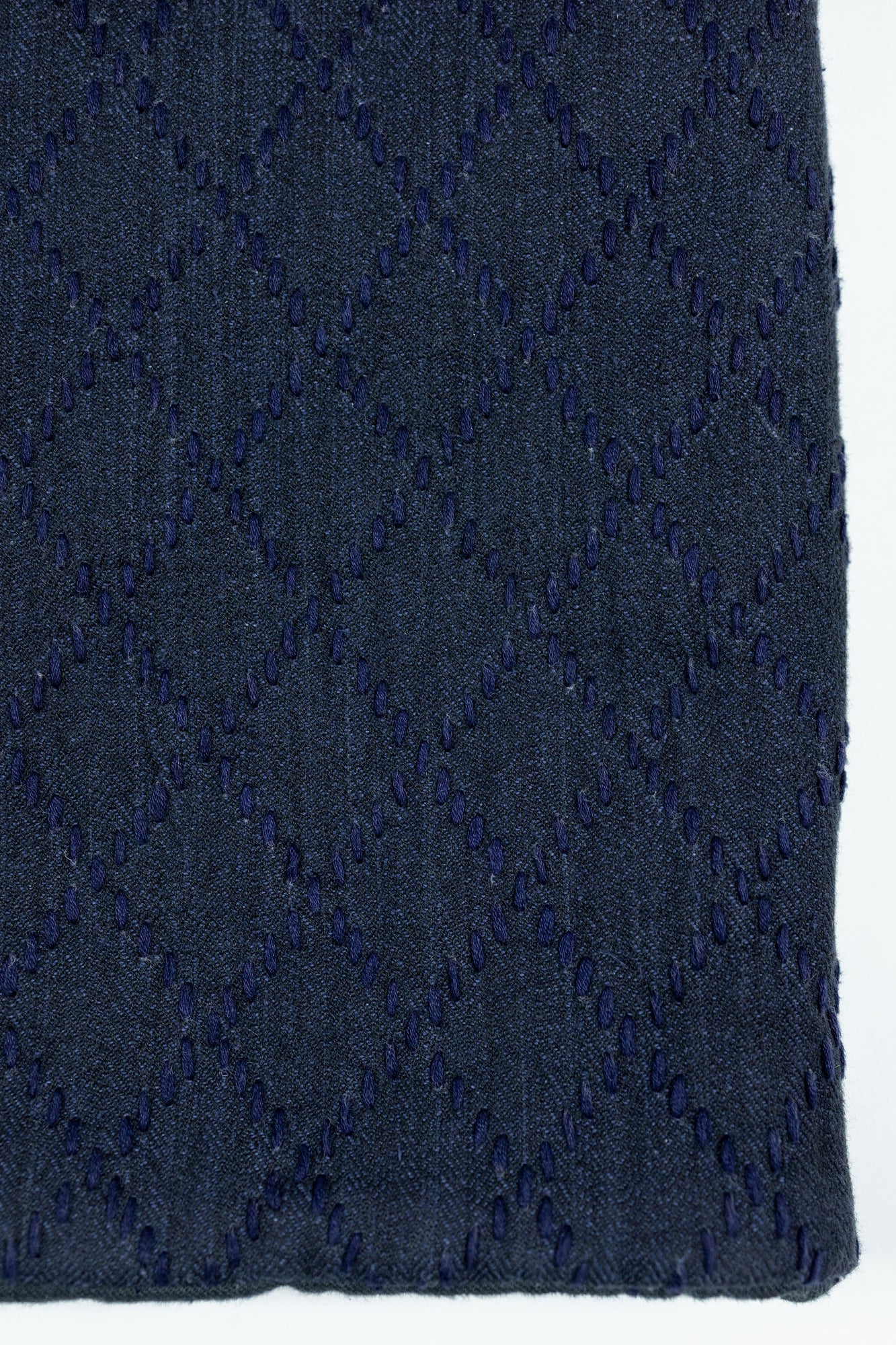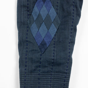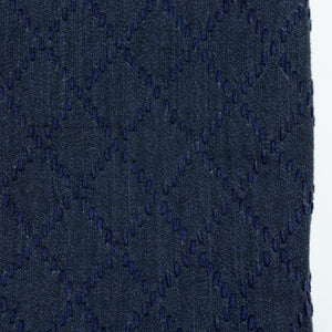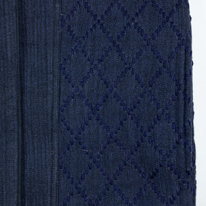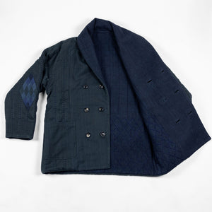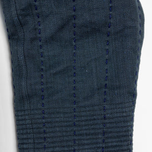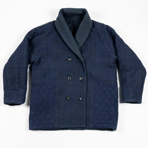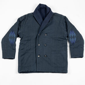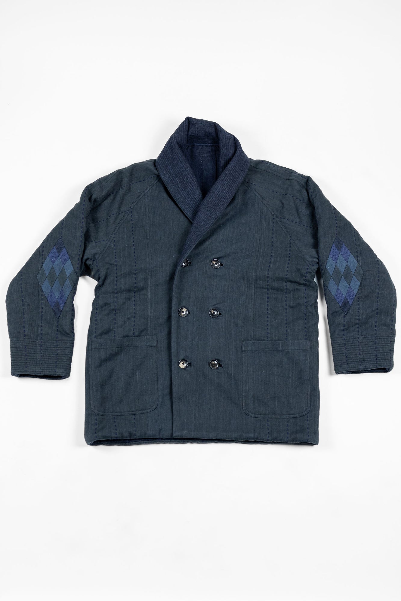 The Reversible Shawl Overcoat is based on Vintage military Mackinaw Coats from the 1940’s. As the name states, this overcoat is reversible, with one side showcasing Indi + Ash's iron/indigo military herringbone, and the reverse side showing the brand's iron/indigo denim fabric. One side features a stunning Morningstar quilt applique while the reverse has kendo jacket inspired diamond kantha stitching. The entire garment is has diamond quilting throughout, which was manually quilted on a sewing machine to control the amount of batting. The collar, placket, and cuffs feature trapunto stitching done on a single needle machine. Each side has a six button horn closure.