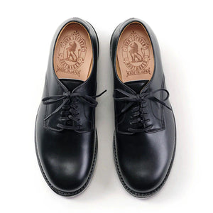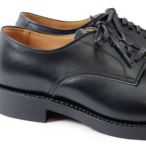 A reproduction of USN and USMC low quarter shoes, first issued in WW2, John Lofgren's version follows the same construction guidelines as the original, but built with premium materials and made ultra robust. The khaki uniform, which included a low plain toe shoe, was first approved for officer use in 1941. The original low quarter shoes were made in black or brown chrome calfskin, had a Goodyear welt leather sole, a plain toe, and followed a classic blucher pattern, all seen here in Lofgren's version. The JLB version is elevated with luxe French calfskin, Italian made Vibram soles and US made Quabag heels, and Japanese made flat welt and steel shank.