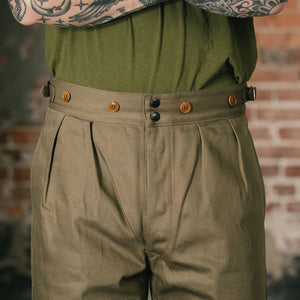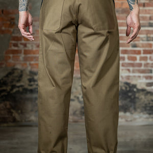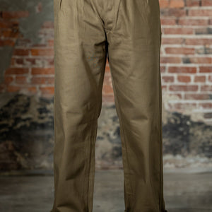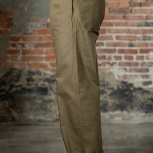 The Digger Trousers are Mister Freedom's take on a rare piece of military gear, vintage 1952 Australian drill pants. They carry all the utilitarian details that make the original special: a snap button fly, high waist, pleated front, and a wide-leg cut built for movement and old-school style. Cut from an 11.5oz brown Katsuragi twill milled in Japan, the fabric has a textured hand and a subtle 3×1 twill pattern reminiscent of vintage French military chinos. The unique fabric is distinctly different from the sheen of tightly woven U.S Mil-spec trousers. The name “Digger” comes from the slang for Australian soldiers, allegedly in reference to trench-digging duties during WWI.