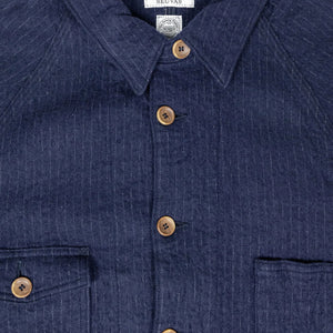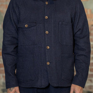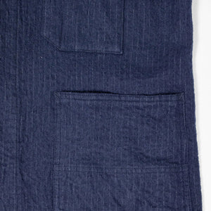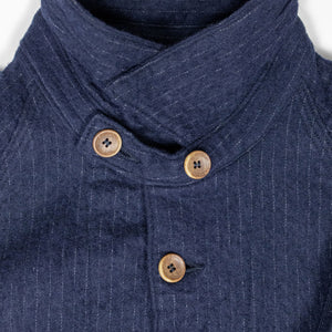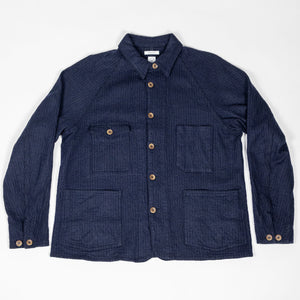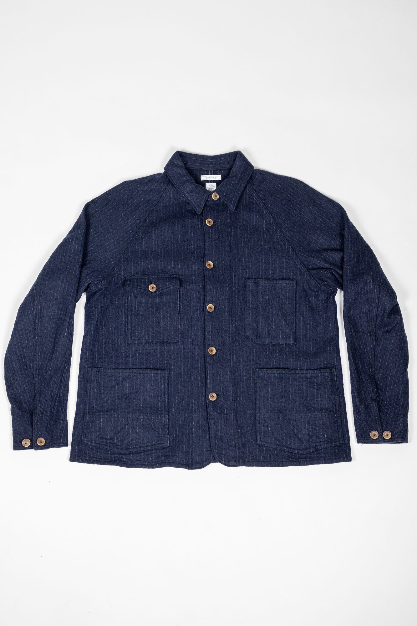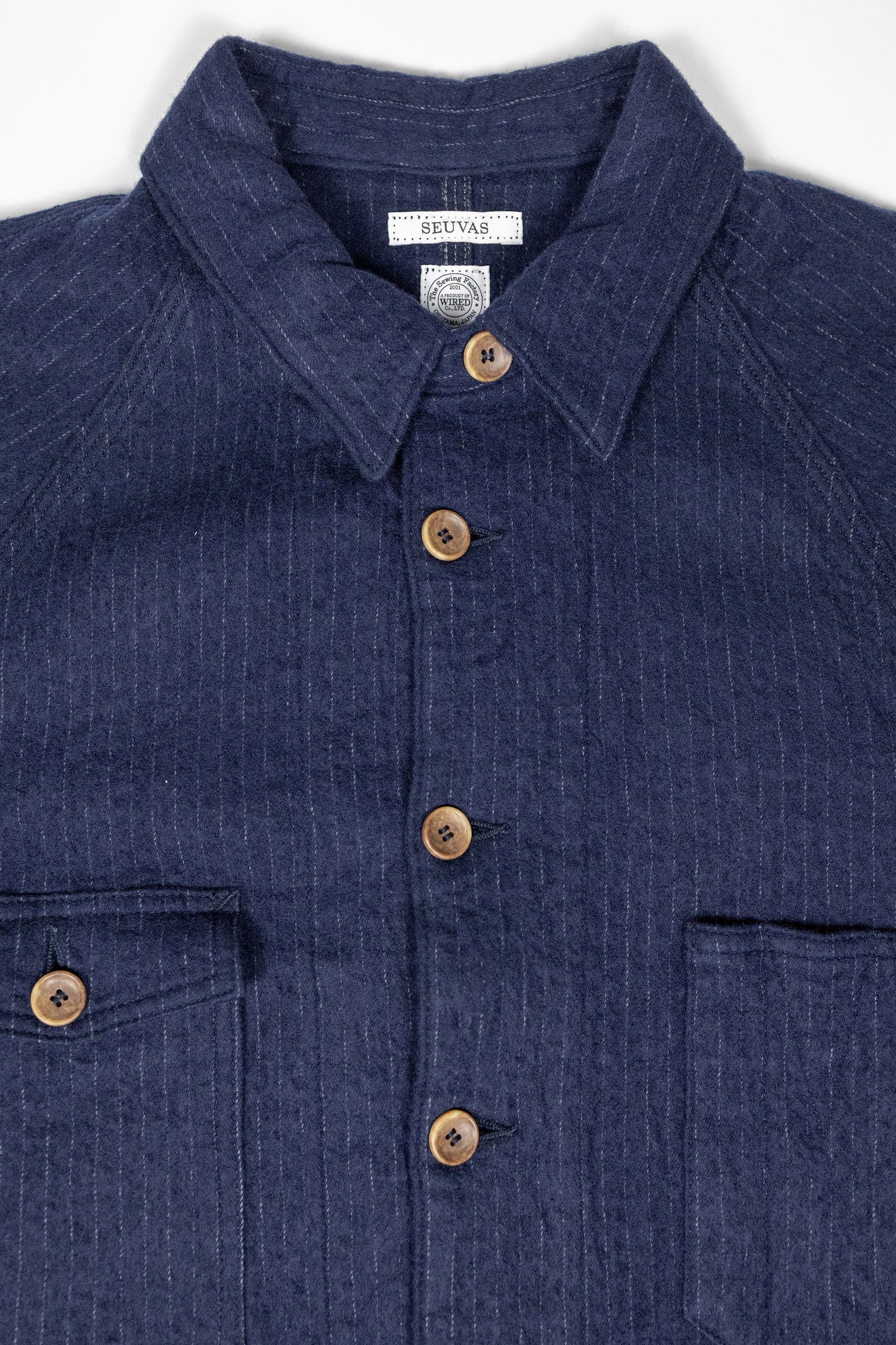 Ready for fall and winter, this coverall from Seuvas is cut from a soft and warm cotton/wool fabric, an ideal choice for any cold weather occasion.Showing off the simplicity and beauty of the material, this coverall features a classic silhouette inspired by vintage chore jackets, with an updated triple stitched raglan sleeve construction. The fabric features a subtle pinstripe pattern that adds texture and visual intrigue.