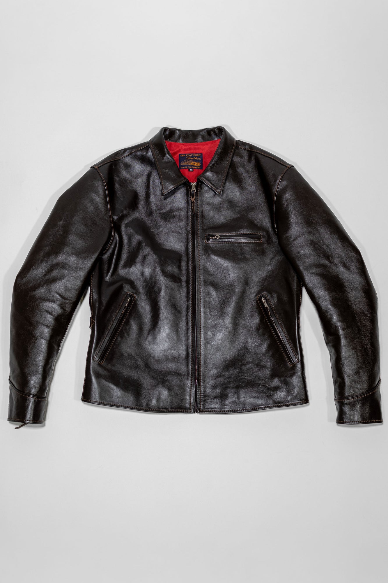 A half-belt, single riders jacket in the style of 1930's sports jackets, The Flat Head's FN-LJ-HS004 features a thoughtfully tailored cut and some truly mind-boggling details. Built by Stockburg, the brand's in-house leather craft workshop, from 1.3mm Shinki Hikaku horsehide, the jacket has been specially tailored for comfort while on a motorcycle. The sleeves, armholes, shoulders, and collar are all shaped for riding, making forward movement easier, reducing strain through the upper arms, and helping the collar stay in place without interfering with a helmet.