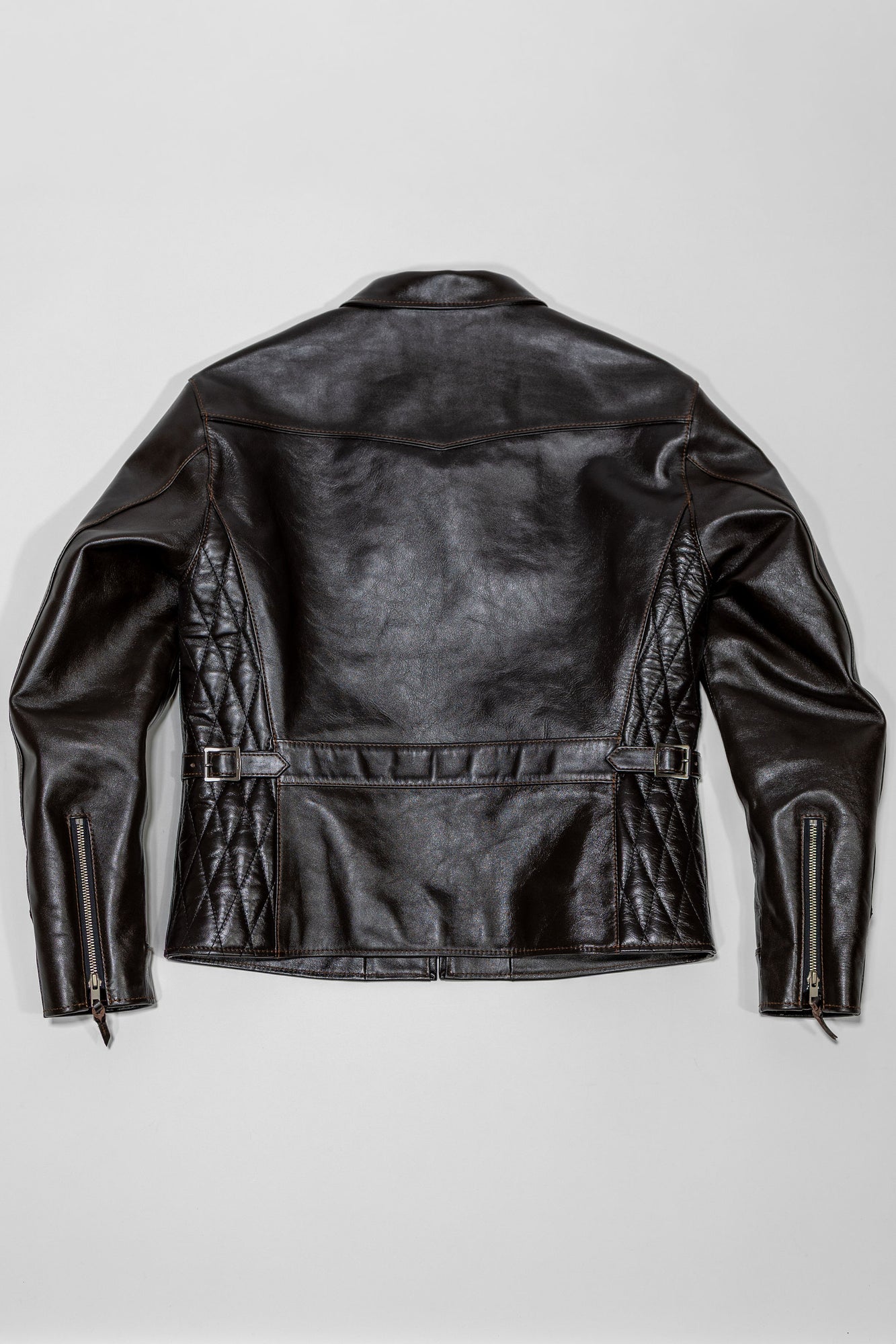 This version of the jacket comes in the extremely limited seal brown color, a super dark shade of brown which, thanks to the leather's semi-aniline teacore finish, will lighten and wear beautifully over time. No detail has been forgone on this jacket. The side panels each sport a remarkable diamond quilted pattern, a feature hardly ever seen on modern leather jackets, while the back yoke and cuffs are adorned with stunning three dimensional piping. The half-belt has not been skived or folded, adding visual weight to the piece, and the jacket has been finished with a luxe rayon twill lining, iron buckle side adjusters, and vintage style Universal zippers throughout.