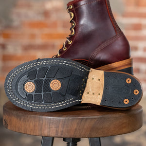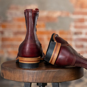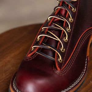 Our latest collaboration with Wesco Boots is a lace-to-toe Jobmaster comes in a waxy Burgundy Domain leather. This 8" boot features brass hardware, lightweight brown upper stitching, white outsole stitching, a back pull-tab, and black Wesco Super Grip soles.
